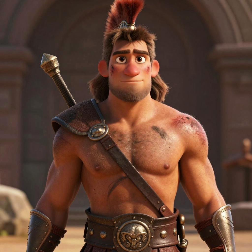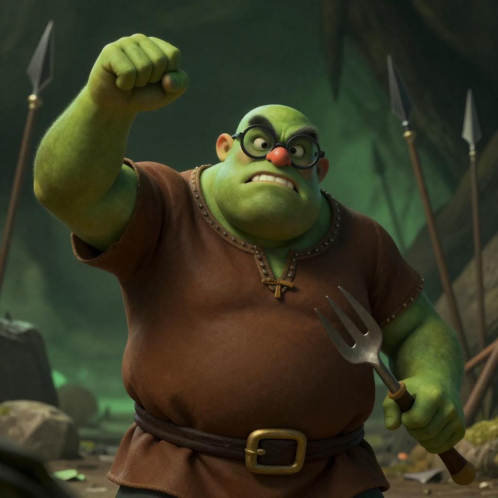 An angry, obese, green-skinned man with glasses and a red nose, wearing a brown tunic, raises his right fist and holds a fork in his left hand. He is in a dark, green-lit cave with spears in the background. Low-angle view.