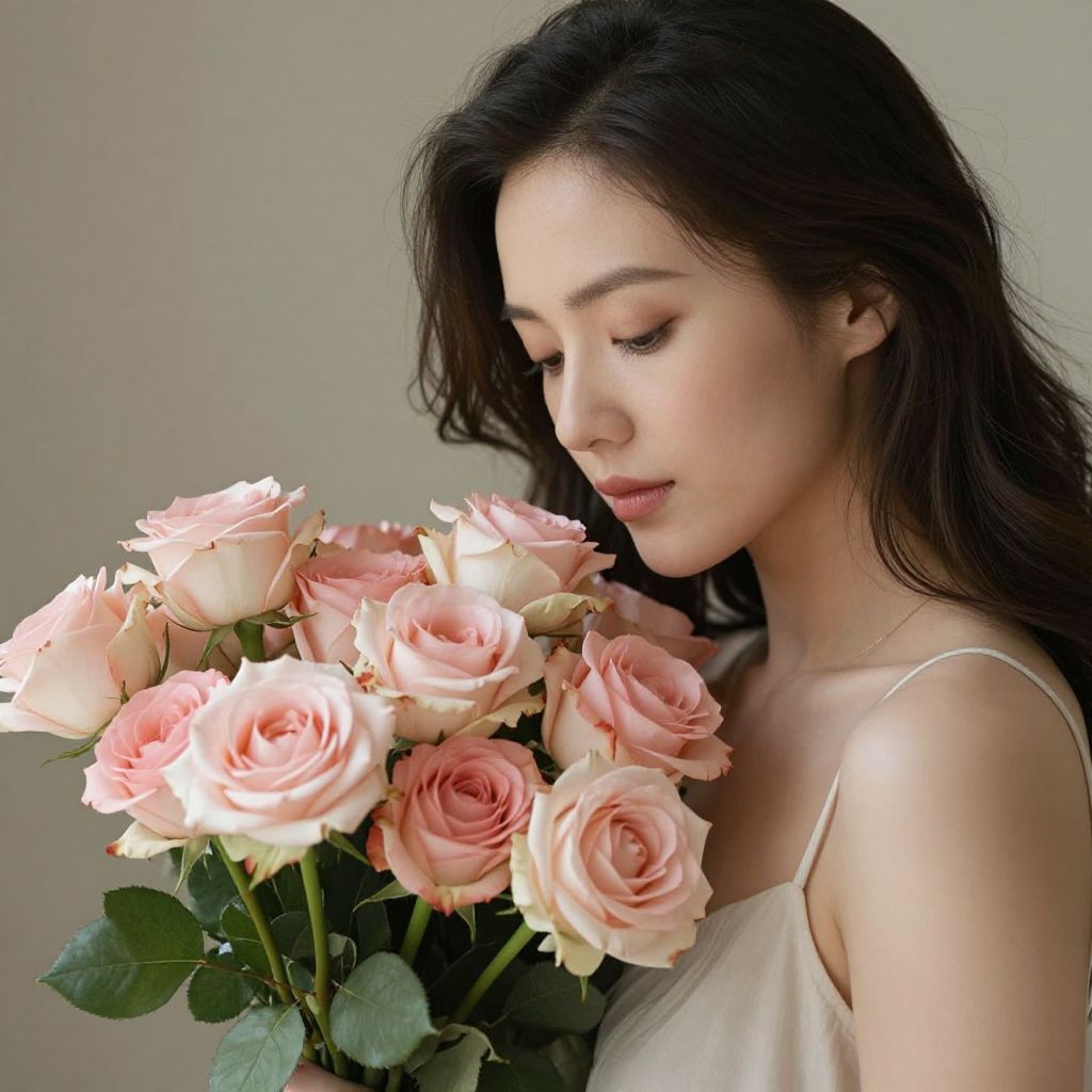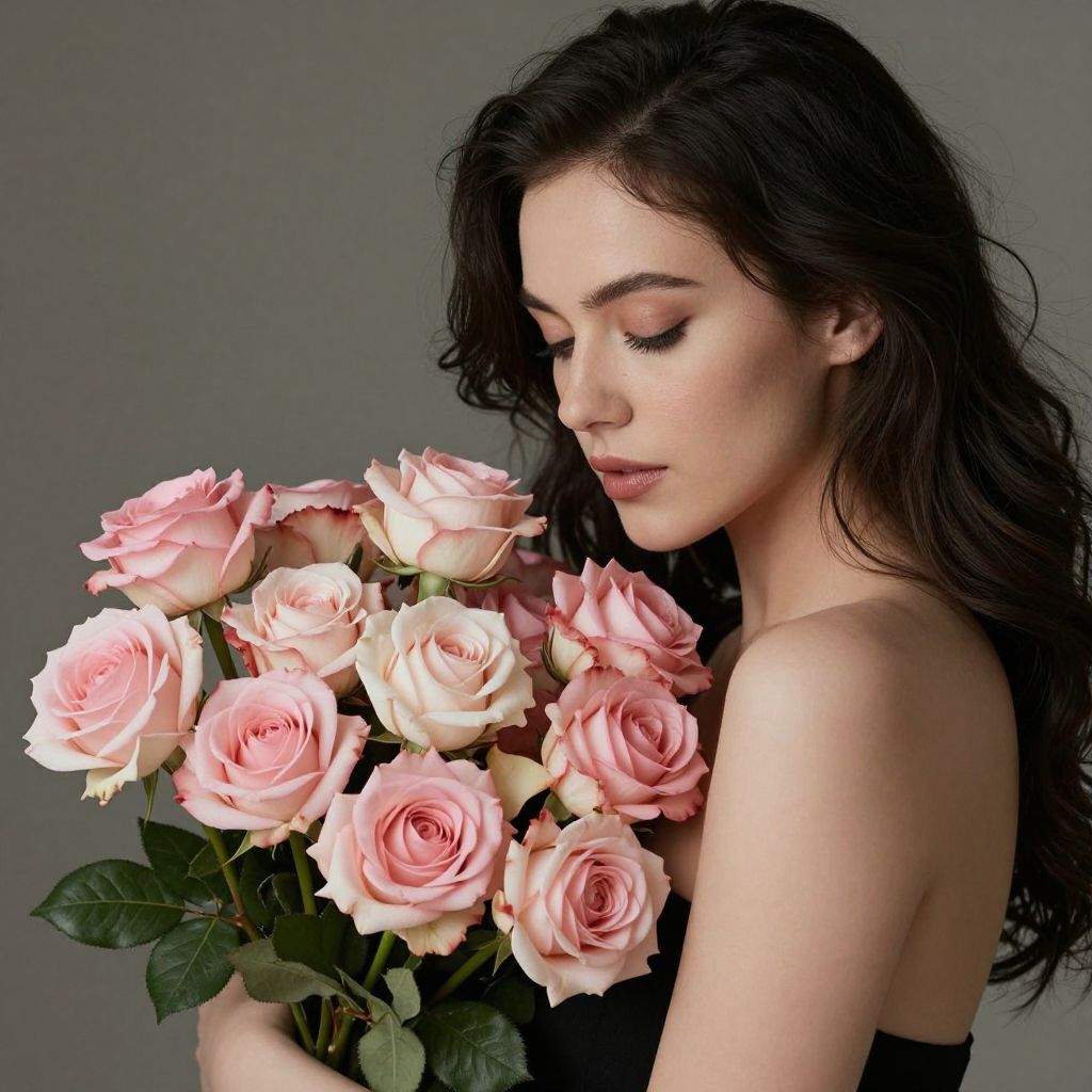 Photograph of a young woman with fair skin and long, wavy dark brown hair, holding a bouquet of pink and peach roses. She has closed eyes with subtle pink eyeshadow, and wears a black strapless top. The roses are fresh, with soft petals and green leaves, positioned to the left of her chest. The background is a solid, muted gray, making the subject and flowers the focal points. The lighting is soft, highlighting her delicate features and the gentle color of the roses. The overall style is elegant and romantic.