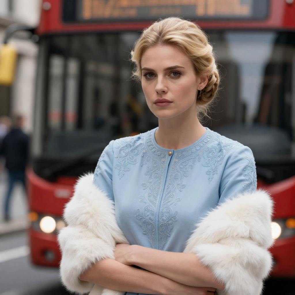 Photograph of a blonde woman with an elegant updo, wearing a light blue, intricately embroidered blouse with white fur sleeves. She stands in front of a red bus, with blurred pedestrians in the background. Her expression is serious, and she crosses her arms in front of her. The scene is urban.
