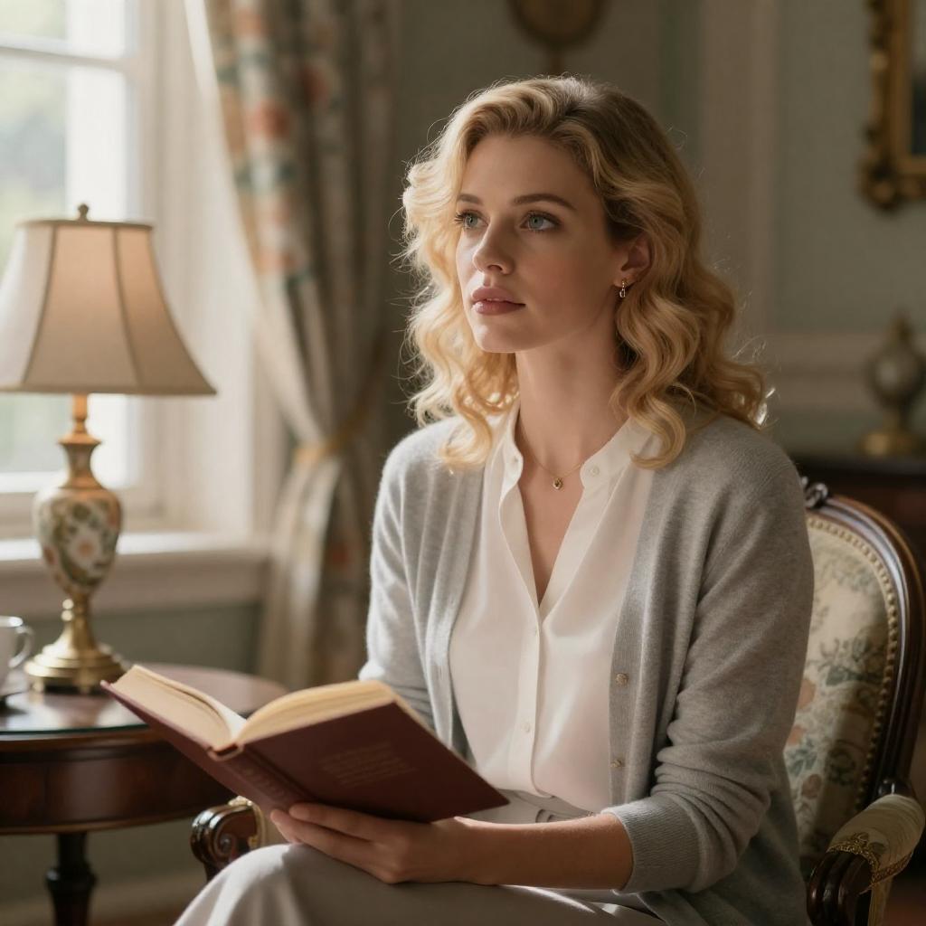 Blonde Updo in Embroidered Blue Blouse