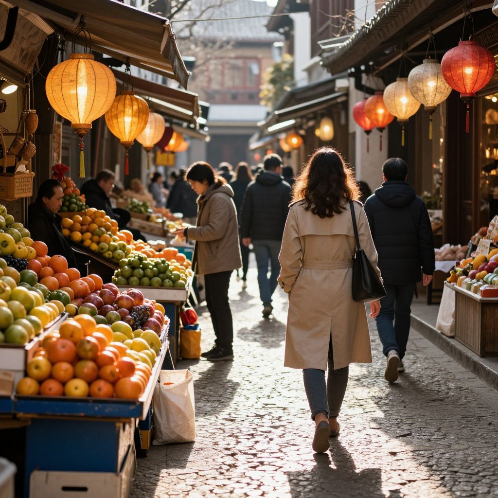 A lively sunlit cobblestone alleyway featuring vibrant fruit stalls on either side and illuminated by traditional hanging lanterns. Shoppers, including a woman in a beige trench coat with a black handbag, browse the market, creating a warm and bustling atmosphere. The scene captures a blend of traditional market charm and everyday urban life.