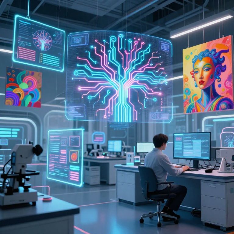 Open AI DALL-E illustrating a futuristic AI lab filled with glowing holograms, neural network patterns, and surreal AI-generated art pieces, capturing the synergy between technology and creativity with vivid colors and a high-tech aesthetic.