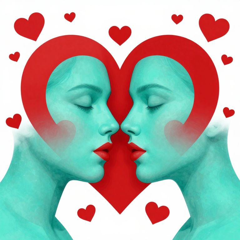 Two turquoise faces merge into a single heart-shaped visage, adorned with bold red accents and surrounded by scattered hearts, creating a surreal and romantic fusion of love and identity.