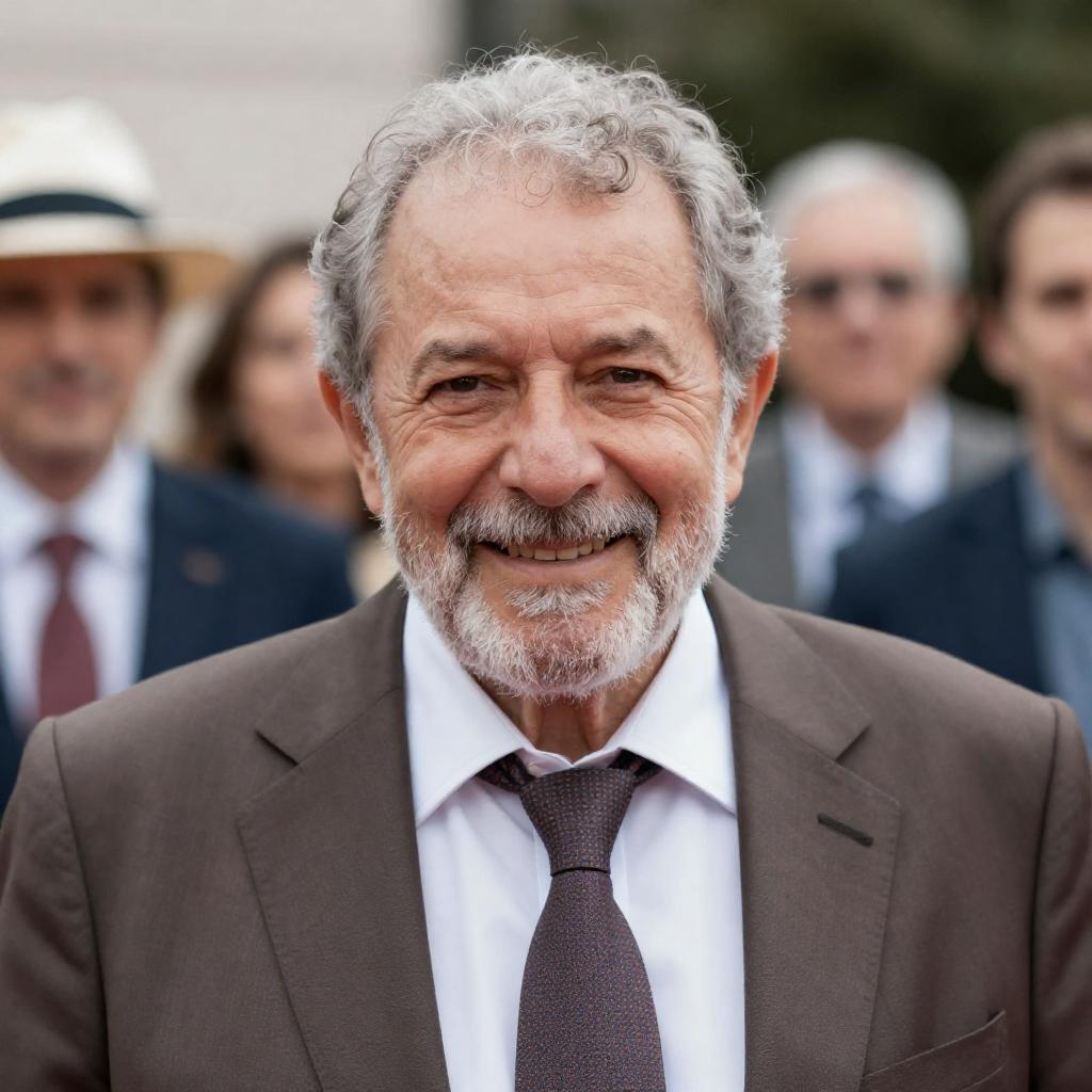 Photograph of an older man with gray curly hair and a white beard, smiling, wearing a brown suit, white shirt, and patterned tie. Background includes blurred people, one in a white hat. Bright outdoor setting. Three people in background.