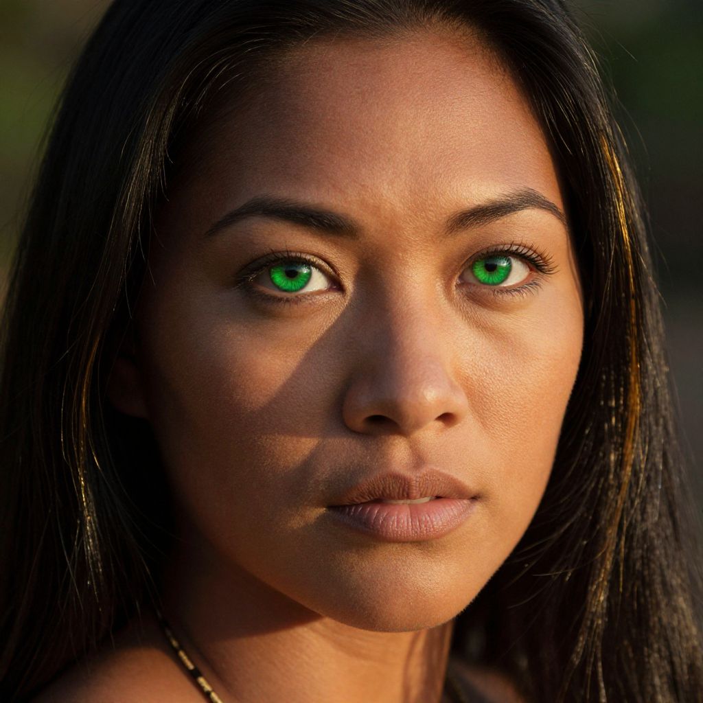 Envision a captivating portrait of a Pacific Islander woman with striking green eyes and lustrous black hair, subtly highlighted by golden tones. Dramatic side lighting enhances her chiseled features, casting elongated shadows that add depth to her enigmatic visage. Her intense gaze commands attention, exuding both mystery and tranquility. This hyperrealistic image evokes an emotional journey from intrigue to introspection as viewers become engrossed in the captivating narrative hidden within her mesmerizing eyes.