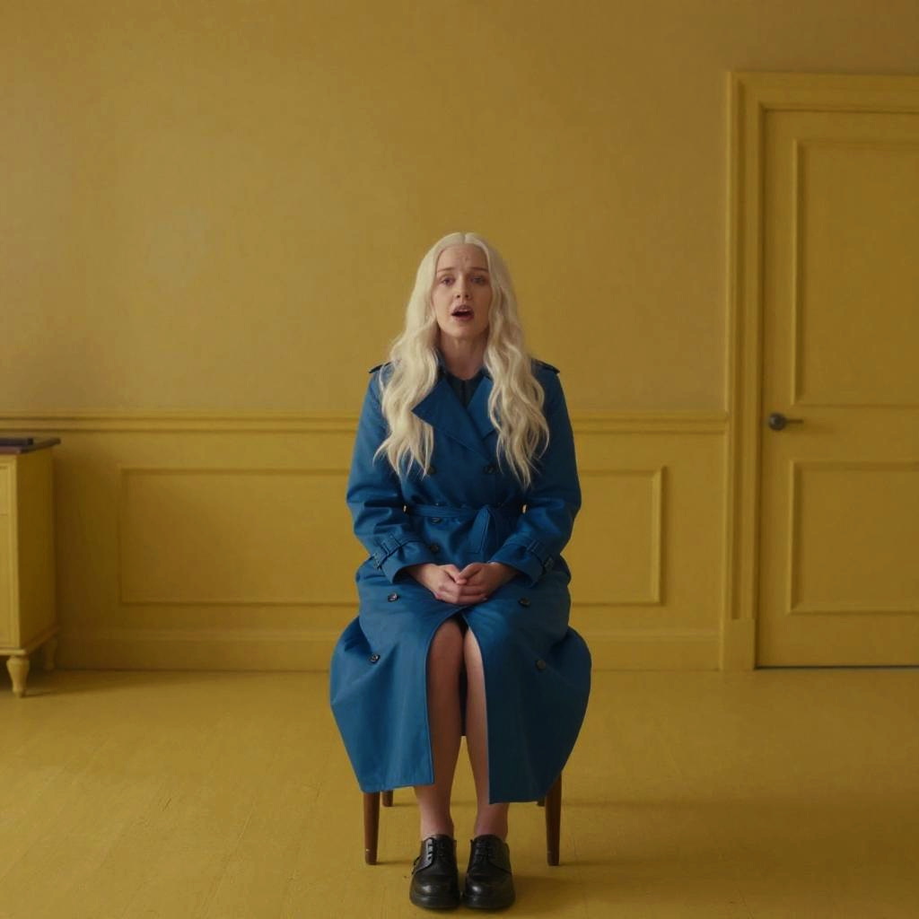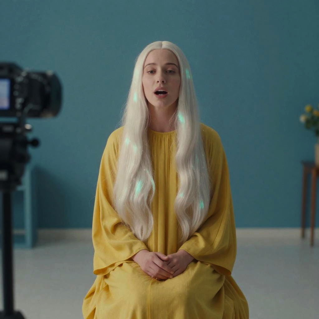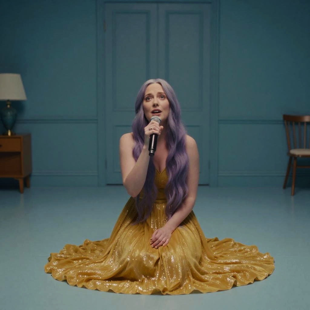 Interstellar Female, long dark teal hair, wearing a mustard yellow ethereal silk dress. Sitting in a teal blue room, singing to herself. Wes Anderson style color schemes, haze, Cinematic, cove lighting, shot with blackmagic pocket cinema camera 6k, 35mm f:2, wide
