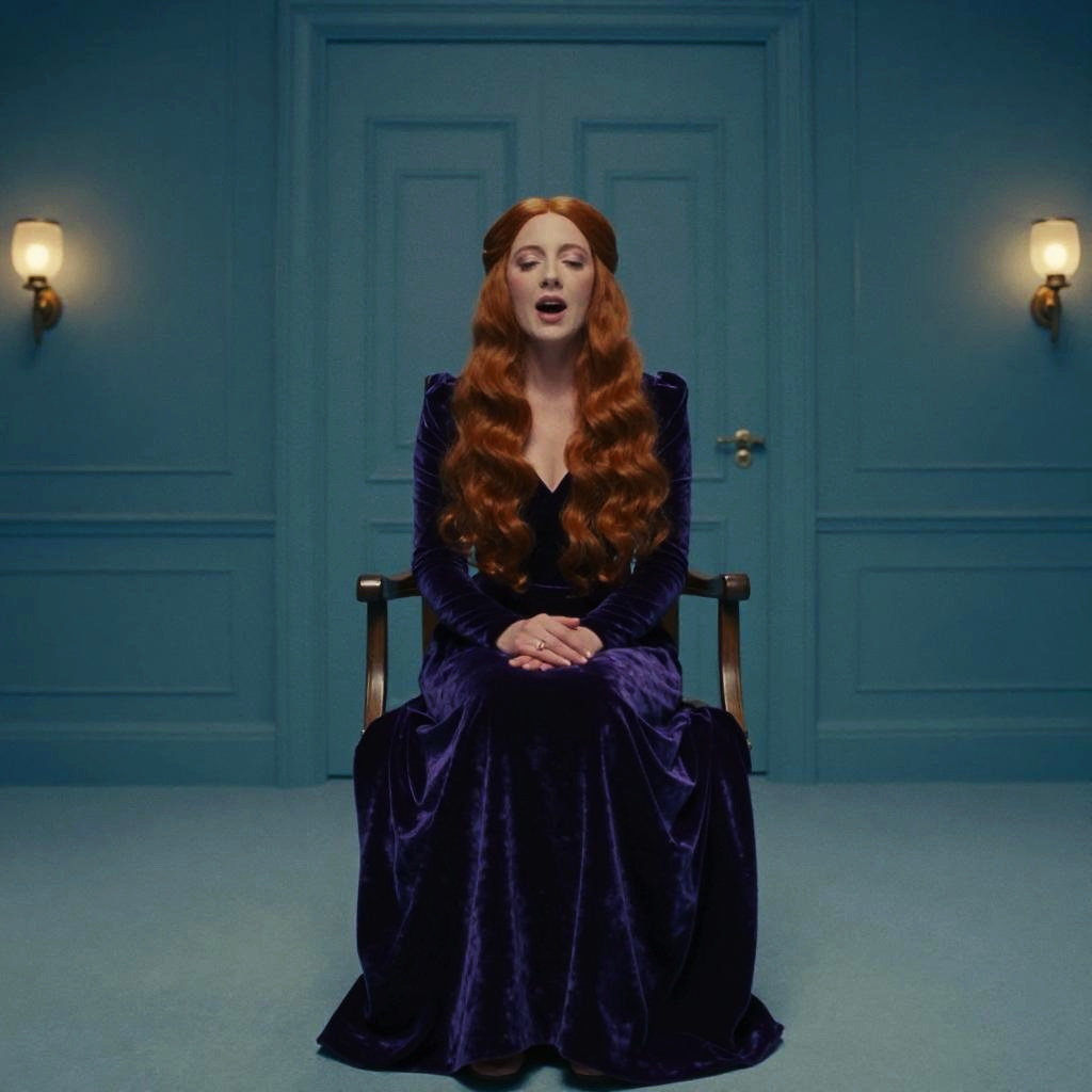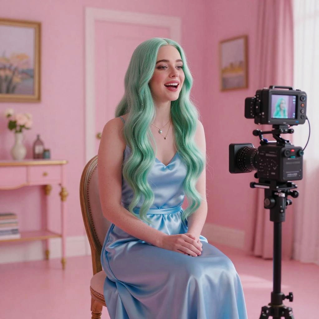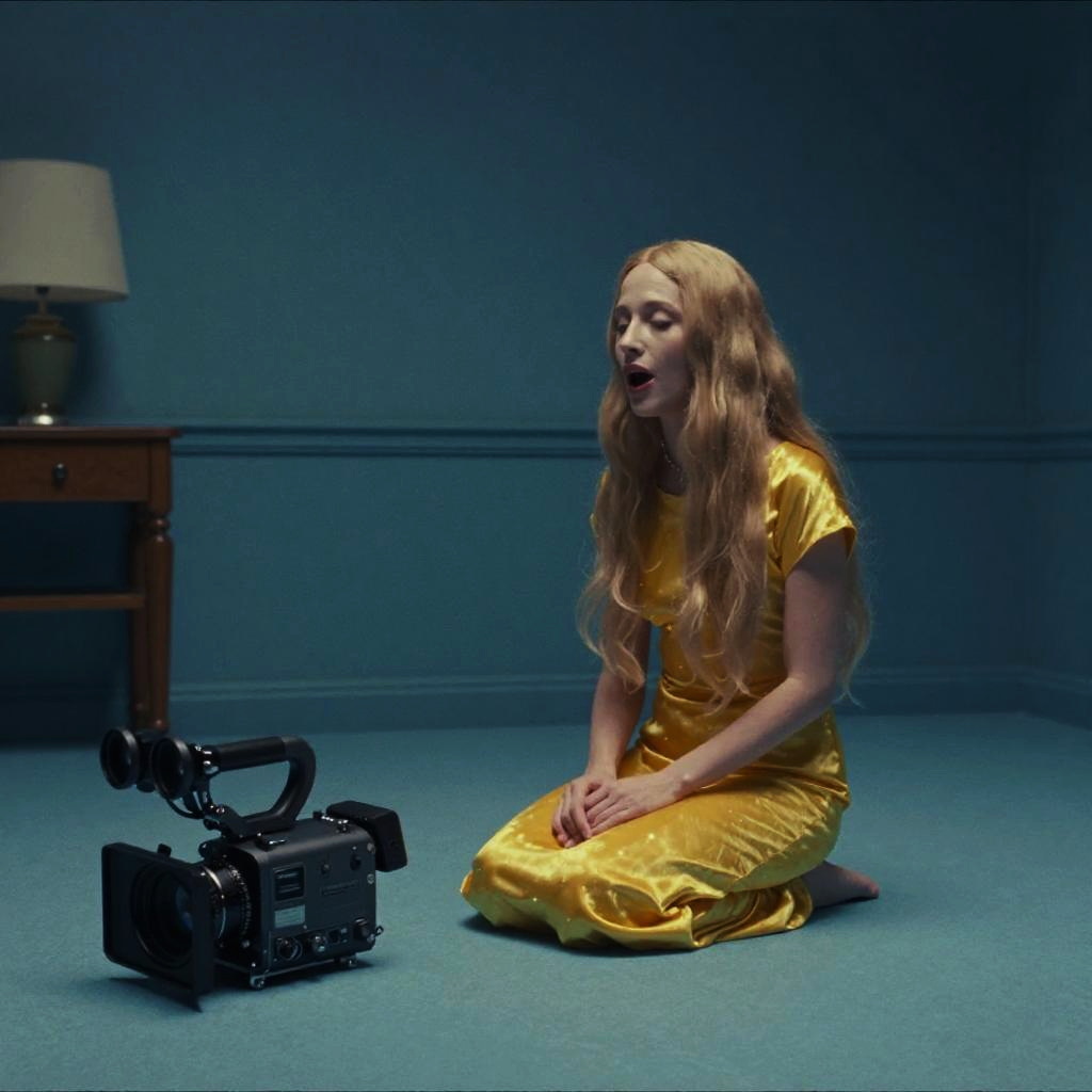 Interstellar Female, long dark teal hair, wearing a mustard yellow ethereal silk dress. Sitting in a teal blue room, singing to herself. Wes Anderson style color schemes, haze, Cinematic, cove lighting, shot with blackmagic pocket cinema camera 6k, 35mm f:2, wide