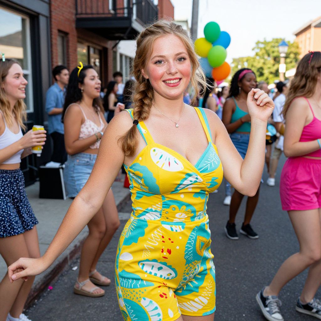A cheerful party jumpsuit woman in her 20s with a rosy complexion, freckles across her nose, and soft blonde hair in a braid, dancing with a group of friends in a bright colorful street party in a downtown neighborhood, wearing a fun, bright yellow and teal patterned jumpsuit with playful designs, surrounded by music and celebration.. The woman has big tits and cute face