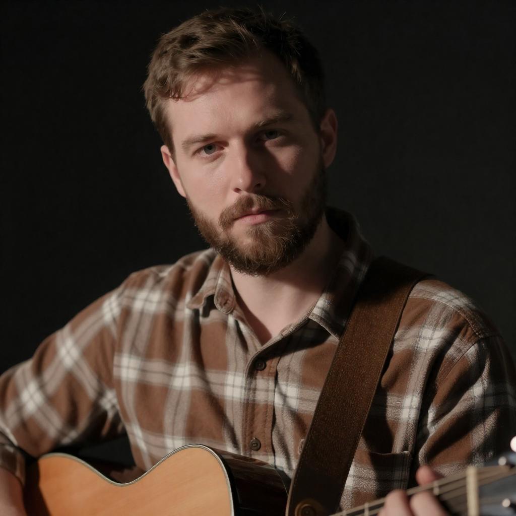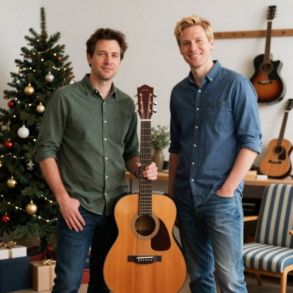 Photograph of a man with light brown hair, wearing a gray button-up shirt and dark jeans, playing an acoustic guitar. He sits with one leg up, focused, singing into a microphone. Background includes dark curtains, a silver disco ball, and a Christmas tree with blue ornaments.