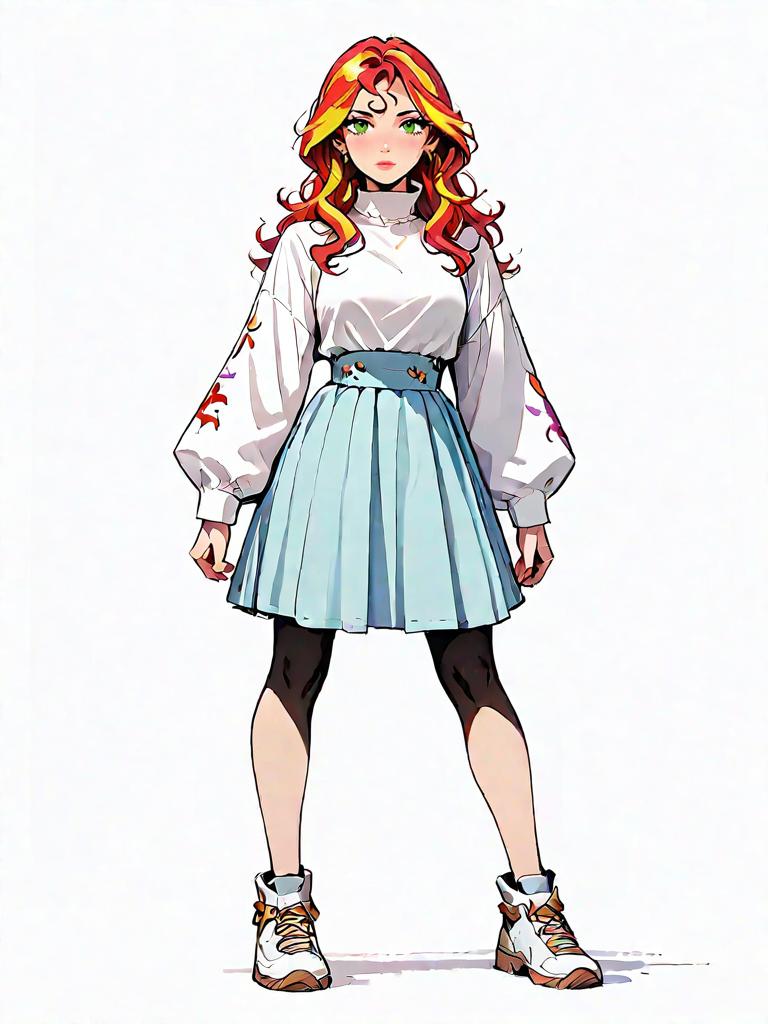 1girl, source_comics, realistic face, full body shot, Woman, casual chic, gold shimmer cropped sweater, crew neck, three-quarter sleeves, black high-waisted velvet skirt, A-line silhouette, knee-length, plain white background