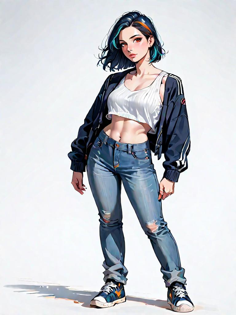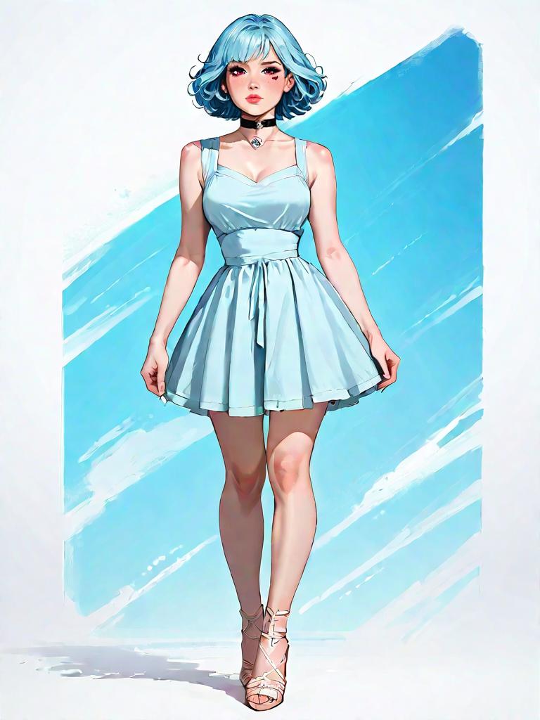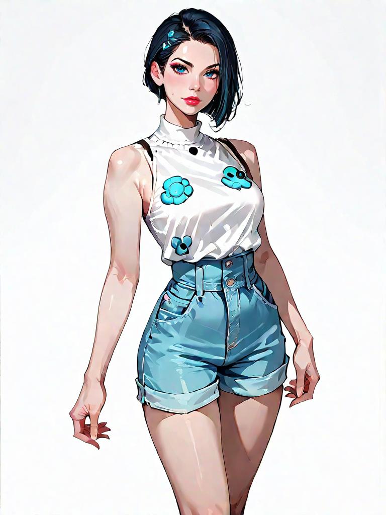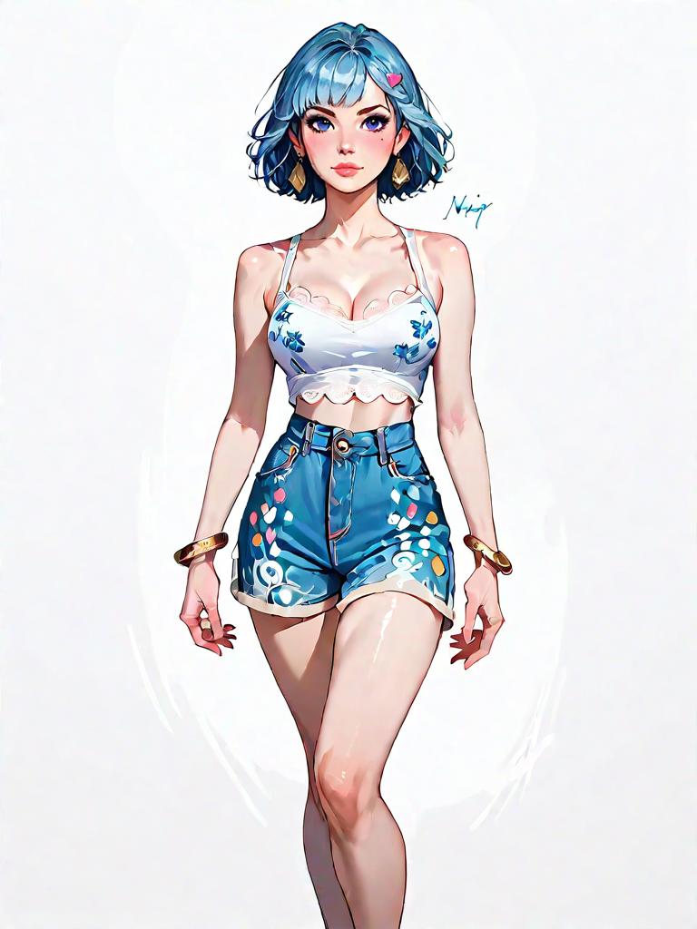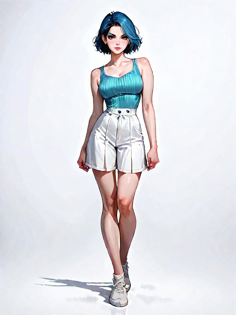 1girl, source_comics, realistic face, full body shot, Woman, athletic leisure, fitted ribbed tank top romper in royal blue, thin shoulder straps, square neckline, short length, solid color, white studio background.