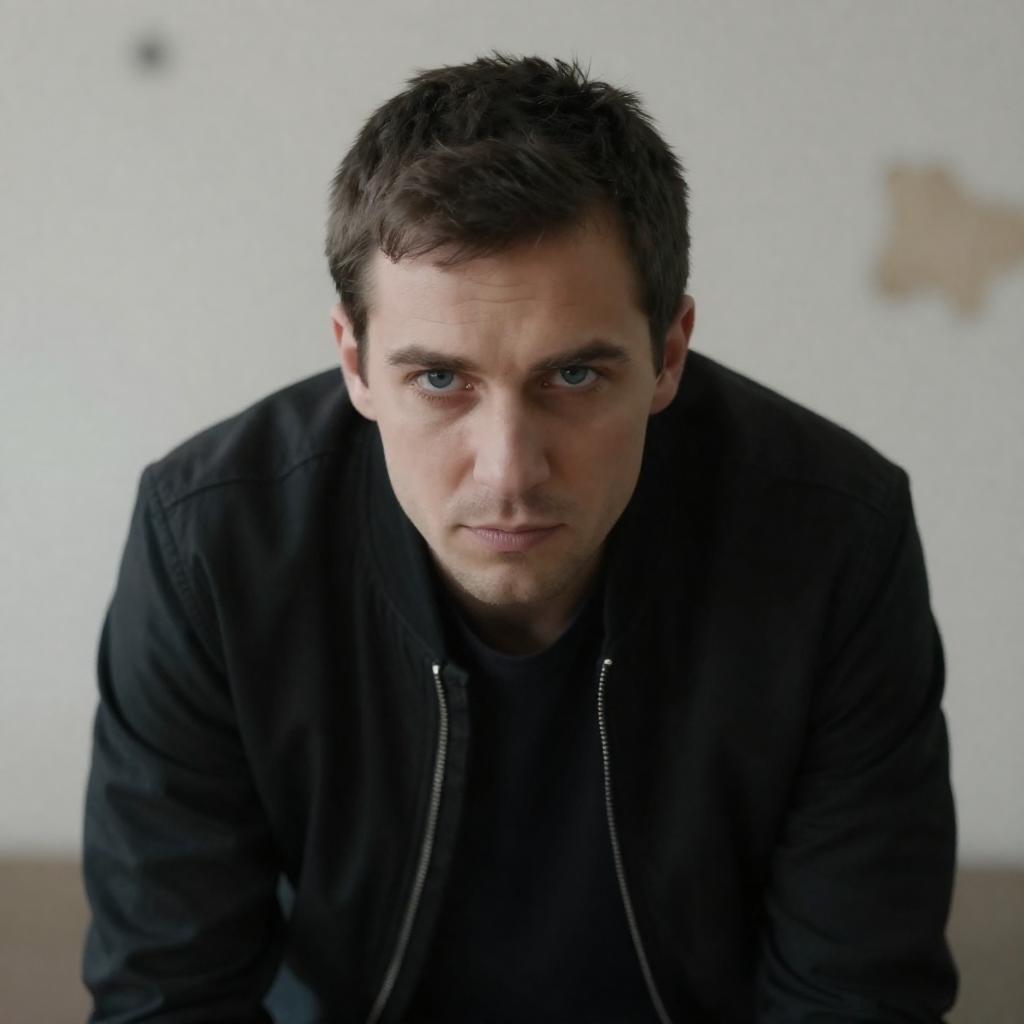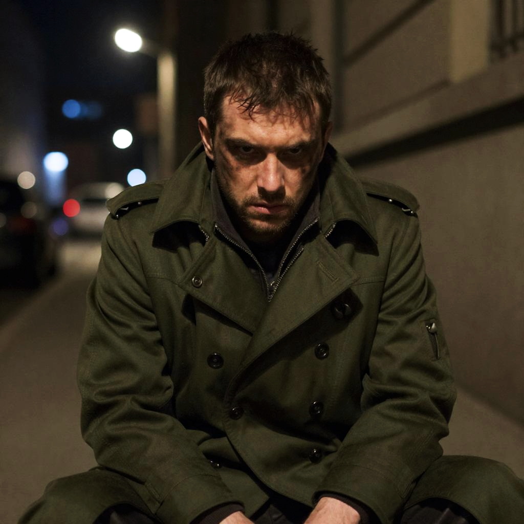 Photograph of a man with dirty face and short brown hair, partially hidden under a large green military-style coat, sitting in a dark alley at night. Background includes blurred city lights and buildings. Man's expression is tense and determined.