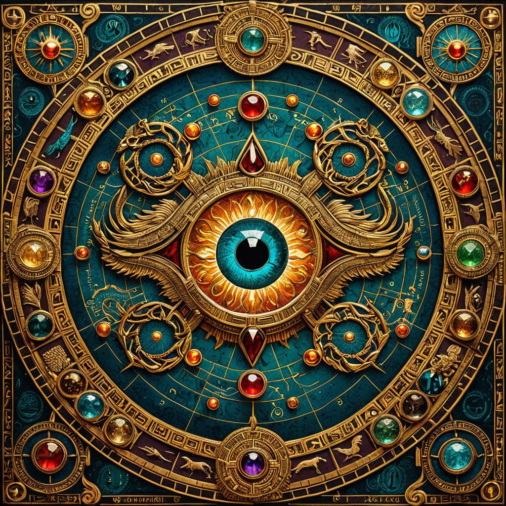 Highly detailed digital artwork depicting an eye spy map featuring an ornate central eye design surrounded by mythical creatures and ancient ruins. The map is rendered in bronze hues and muted metallic tones with vibrant lighting, showcasing intricate design elements and compass-like structures, creating a visual treasure trove of fantasy and ancient symbolism.