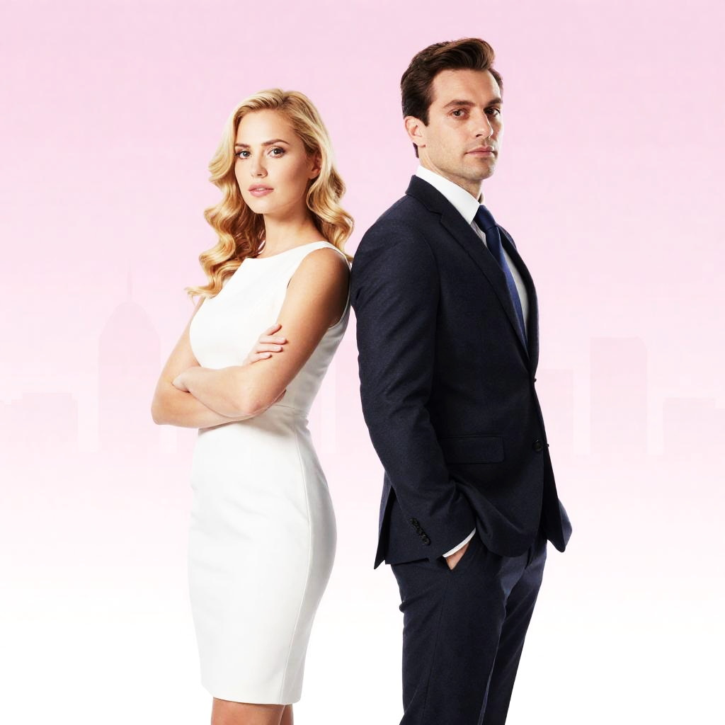 Photograph of two women back-to-back on a black metal chair. One woman with dark hair in a red dress and black heels, laughing, the other with red hair in a pink dress and pink heels, smiling. Background: red cityscape silhouette. Both women's heads tilted back.