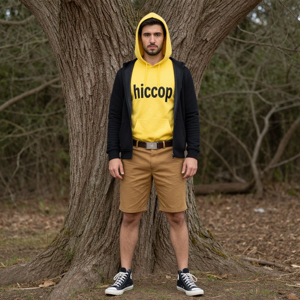 "hiccup costume, 1boy, male focus, solo, shorts, outdoors, hood, tree, realistic, belt, standing, looking at viewer, full body, shoes, nature, facial hair Realistic photo of casual sexy person with pretty face"