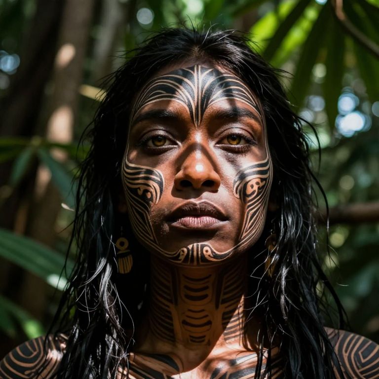 An ultra-realistic portrait captures an enigmatic figure adorned with intricate tribal patterns, their piercing gaze exuding wisdom and mystery. Set against a backdrop of untamed foliage, this unique perspective from below draws viewers into their captivating world. Sunlight filters through dense leaves, casting dynamic shadows across the subject's face, highlighting their profound emotional depth and evoking a range of emotions from intrigue to awe.