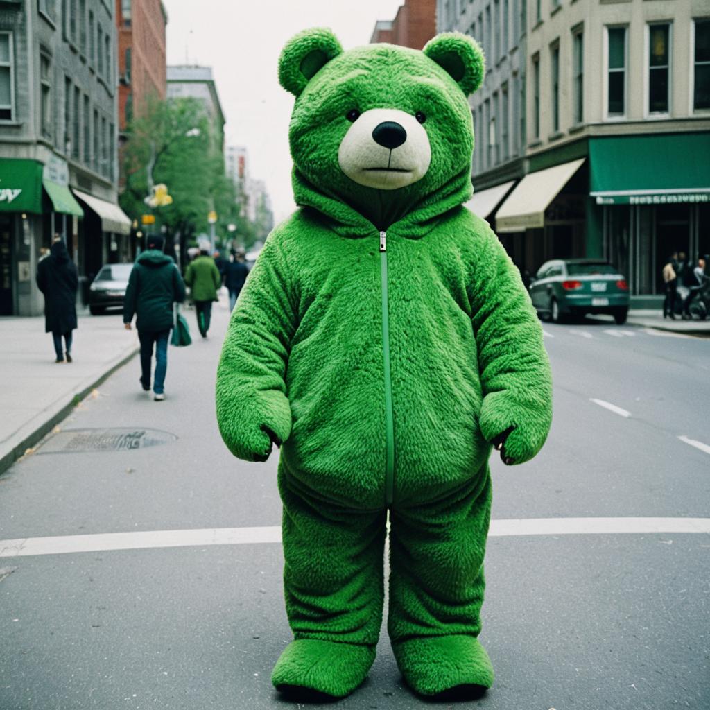 Photograph of a person in a green, fuzzy bear costume standing in a city street with buildings and pedestrians in the background.