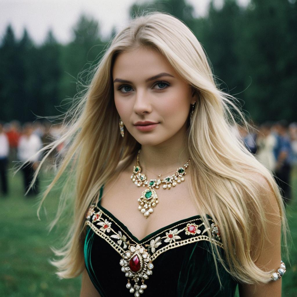 Russian fancy dress,1girl, solo, blonde hair, long hair, looking at viewer, jewelry, necklace, realistic, dress, blurry background, blurry, outdoors