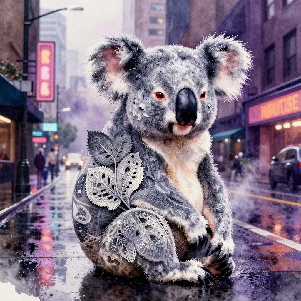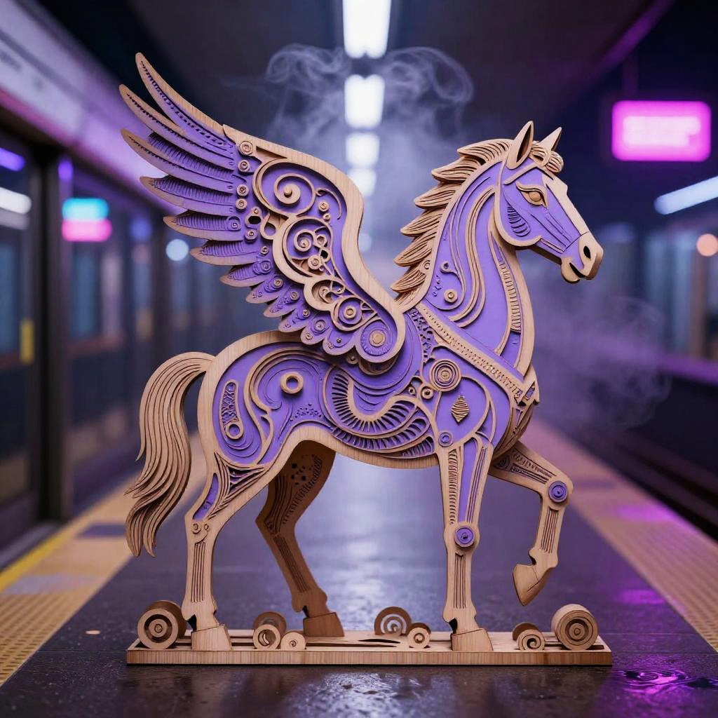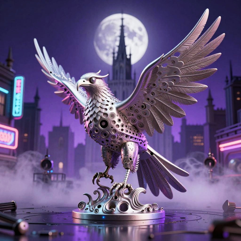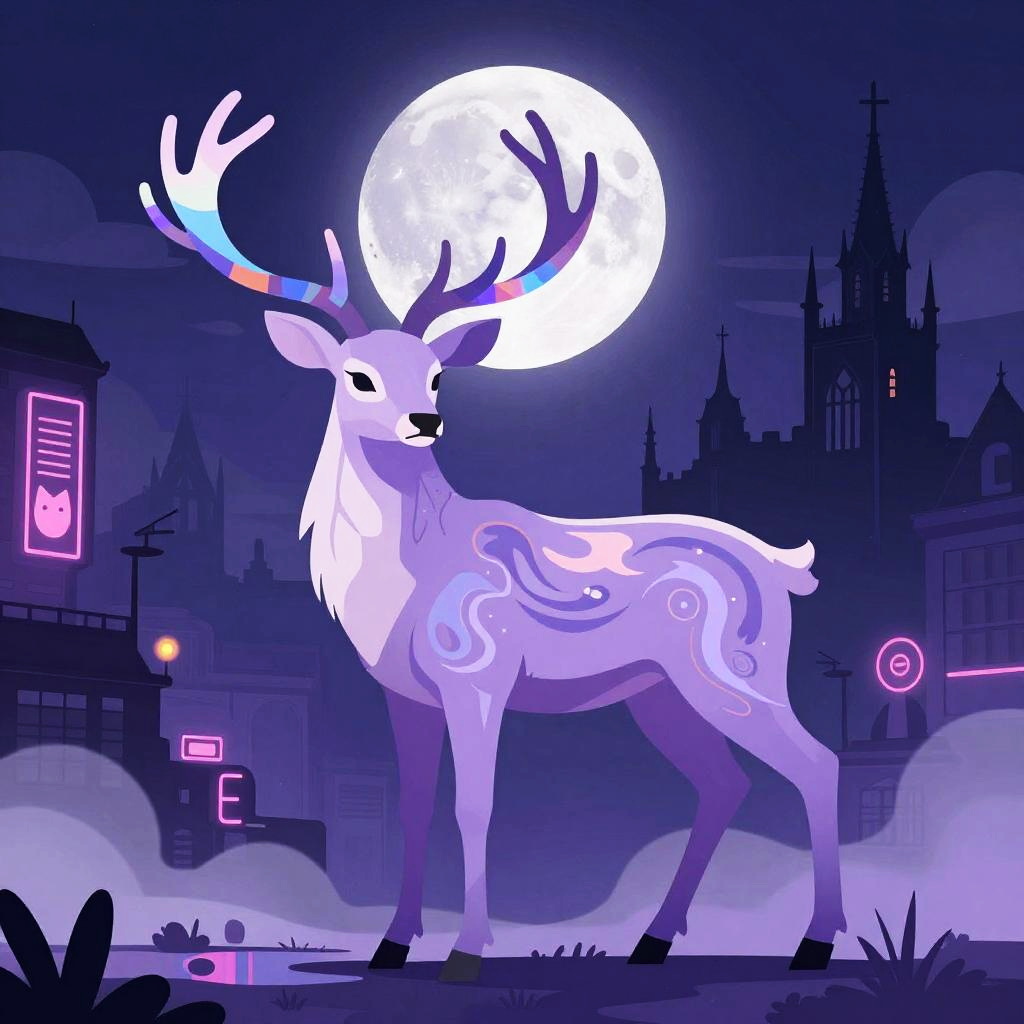 Etched metal relief depicting a copper stag with fractal vines, surrealist anatomy where abstract shapes flow into fur and geometry. Dreamlike moonlit gothic skyline, urban nocturne ambience with reflective puddles, neon signage, billowing steam, prismatic highlights. Vivid violets and lavender, soft volumetric fog, delicate shadows, subtle film grain, crisp edges, intricate micro-detail, high fidelity, immersive atmosphere.