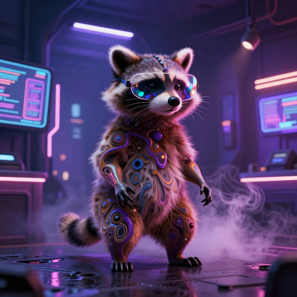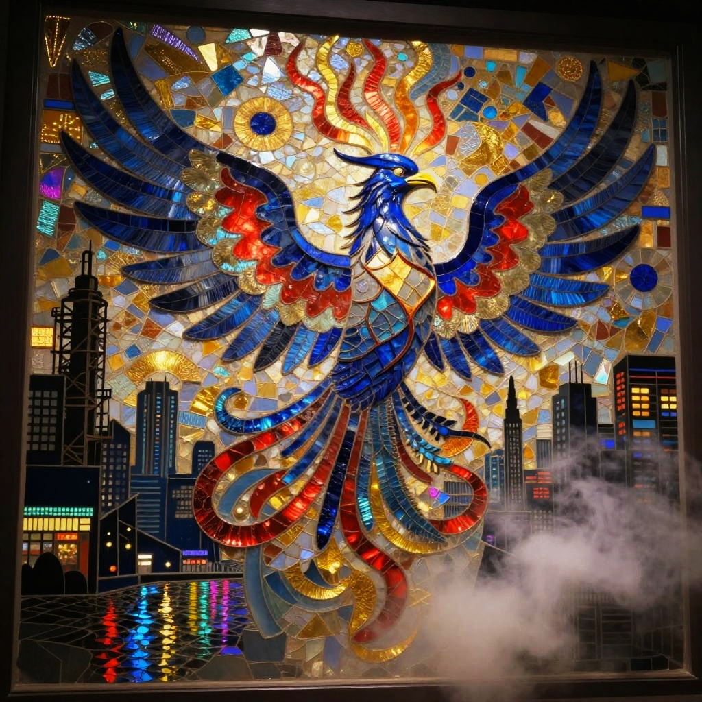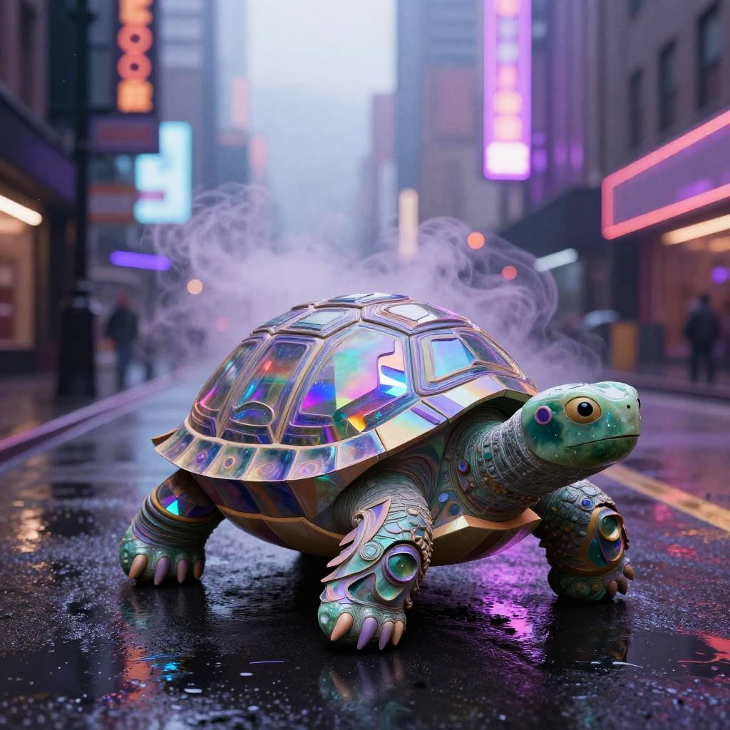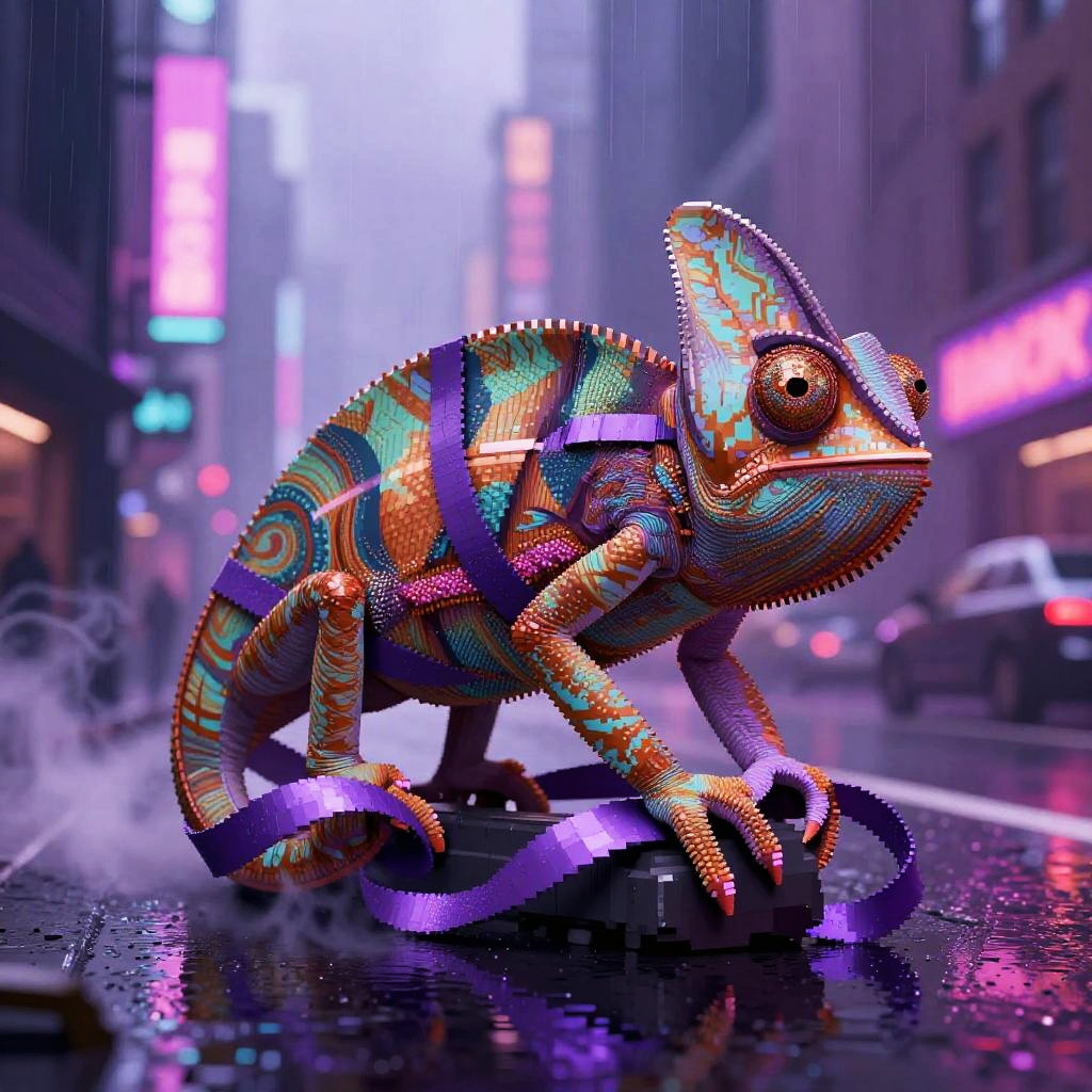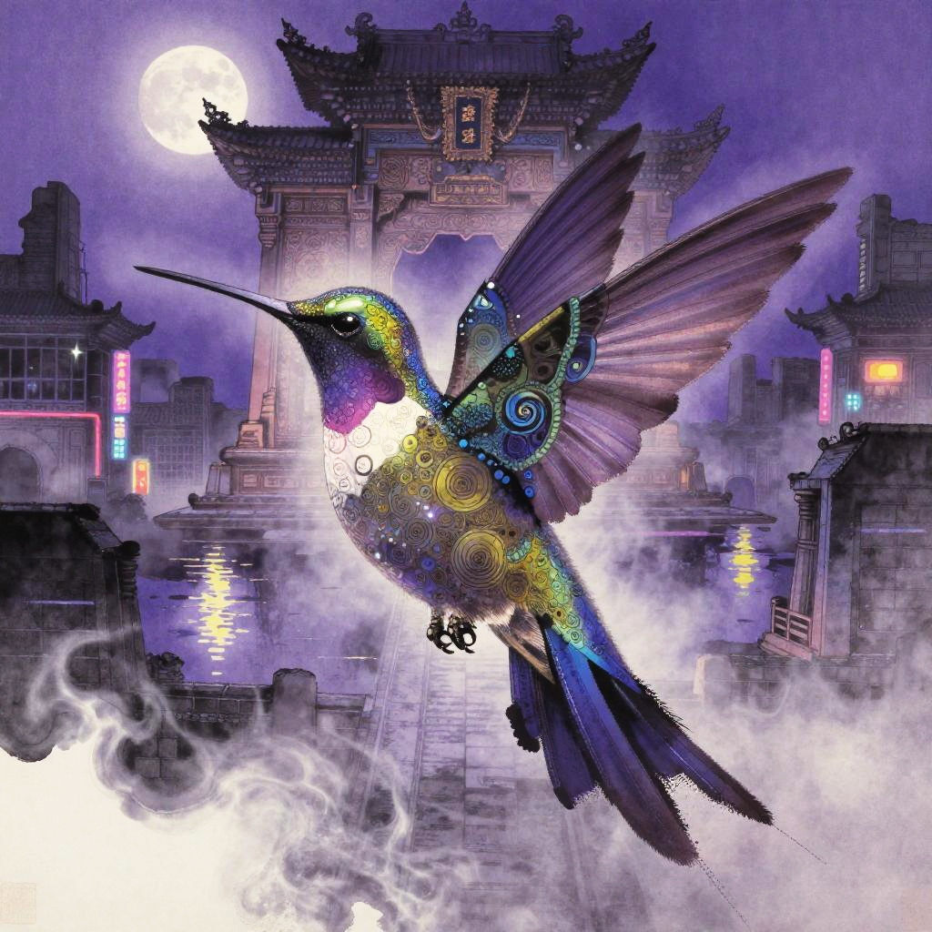 Etched metal relief depicting a copper stag with fractal vines, surrealist anatomy where abstract shapes flow into fur and geometry. Dreamlike moonlit gothic skyline, urban nocturne ambience with reflective puddles, neon signage, billowing steam, prismatic highlights. Vivid violets and lavender, soft volumetric fog, delicate shadows, subtle film grain, crisp edges, intricate micro-detail, high fidelity, immersive atmosphere.