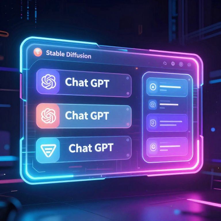 Neon-lit digital interface displaying "Stable Diffusion" with three "Chat GPT" options and icons, against a dark, futuristic background