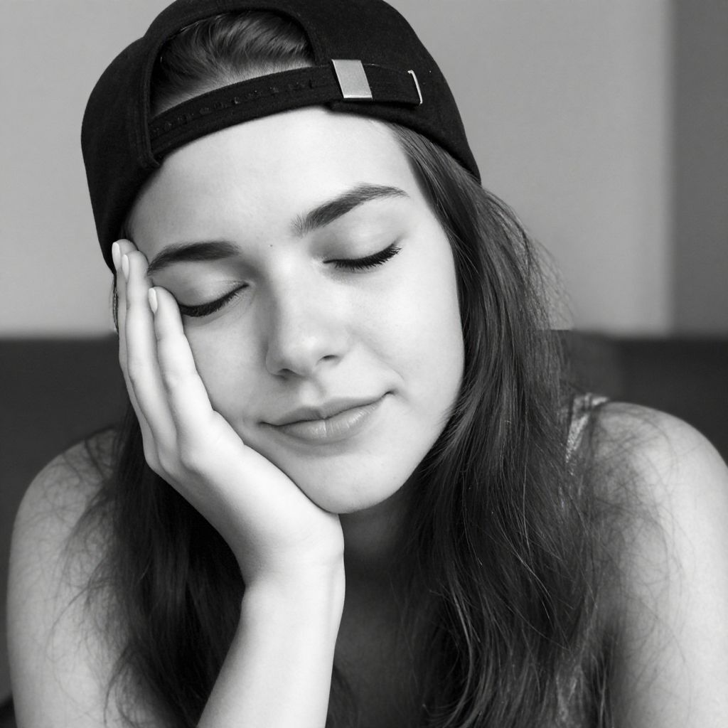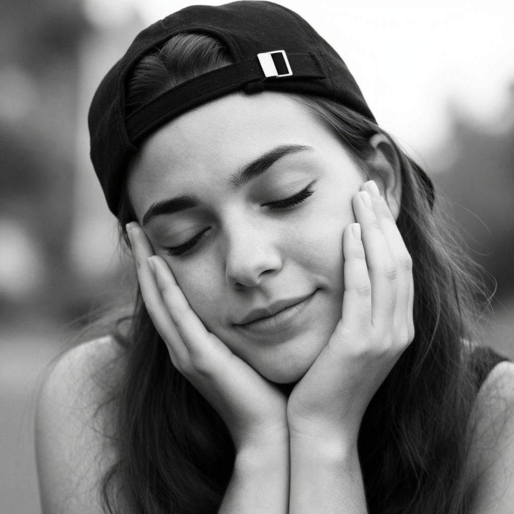 Black and white photo of a young woman with long dark hair, wearing a backward black cap. She's resting her face on her right hand, eyes closed. Her thick eyebrows are prominent, and she's slightly smiling. The background is blurred, suggesting an outdoor setting. The overall vibe is casual and relaxed. Her skin tone is light, and the cap has a small white patch on the front.