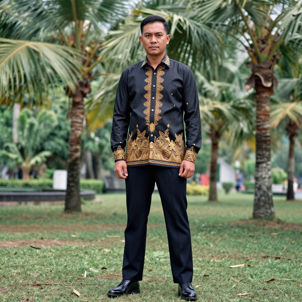 A man, elegant black Batik shirt with gold accents, luxurious satin fabric, straight-cut navy trousers, polished oxford shoes, lush palm trees, kodachrome analog film, confident expression Man has masculine face and piercing eyes