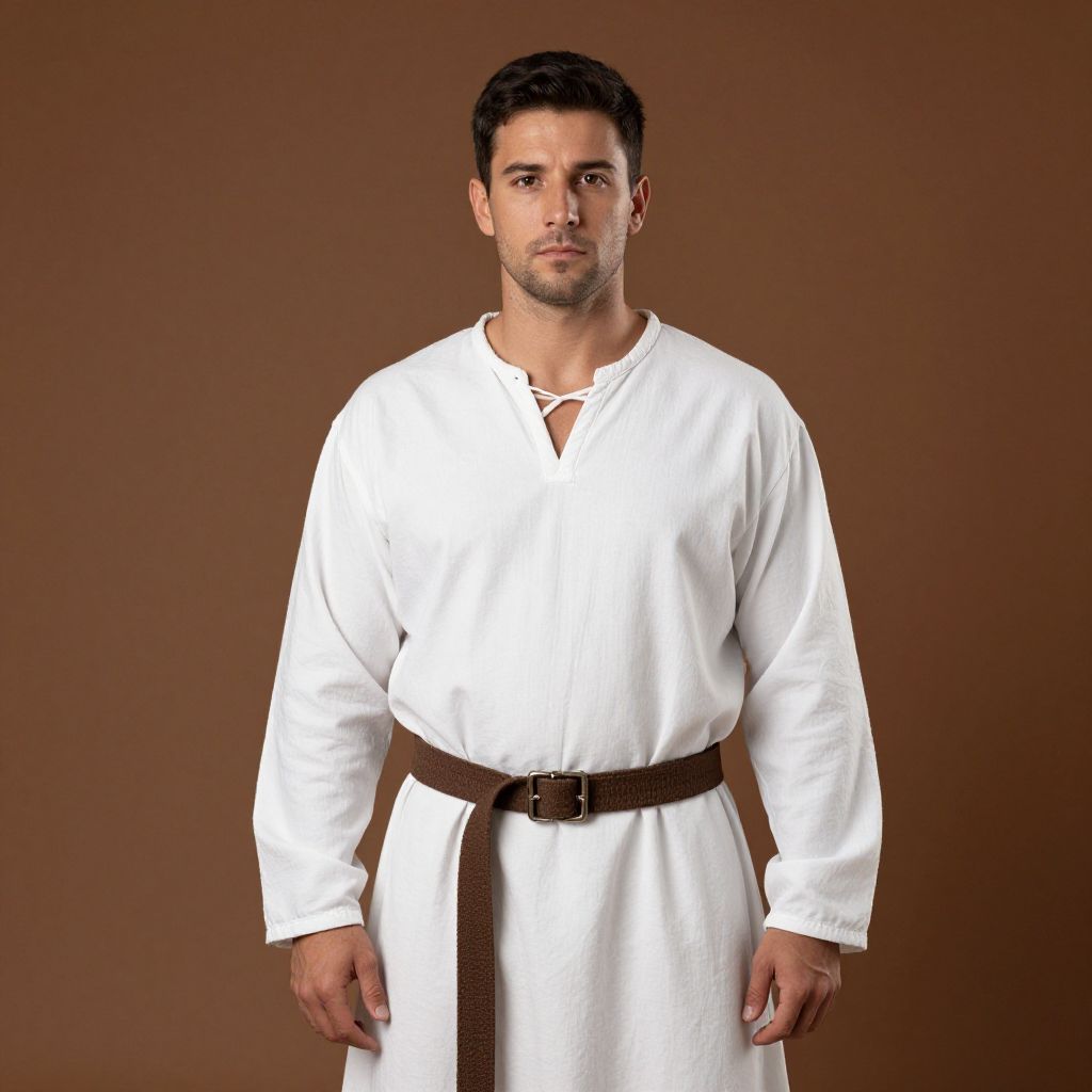 "White Tunic Medieval, man in a white shirt and brown belt standing in front of a brown background"