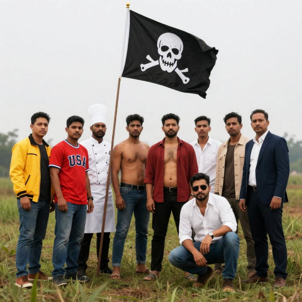Group of eight men standing in grassy field. Left to right: man in yellow jacket, man in red "USA" shirt, naked man, chef hat man, shirtless man, red shirt man, white shirt man, man in beige jacket, man in blue suit. Black pirate flag on pole. Crouching man with sunglasses and shirt. Overcast sky. Casual, varied attire. Flag raised high. Intense expressions.
