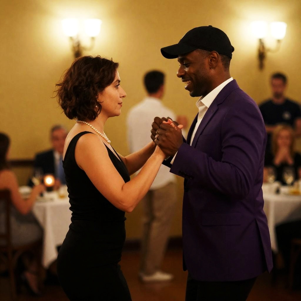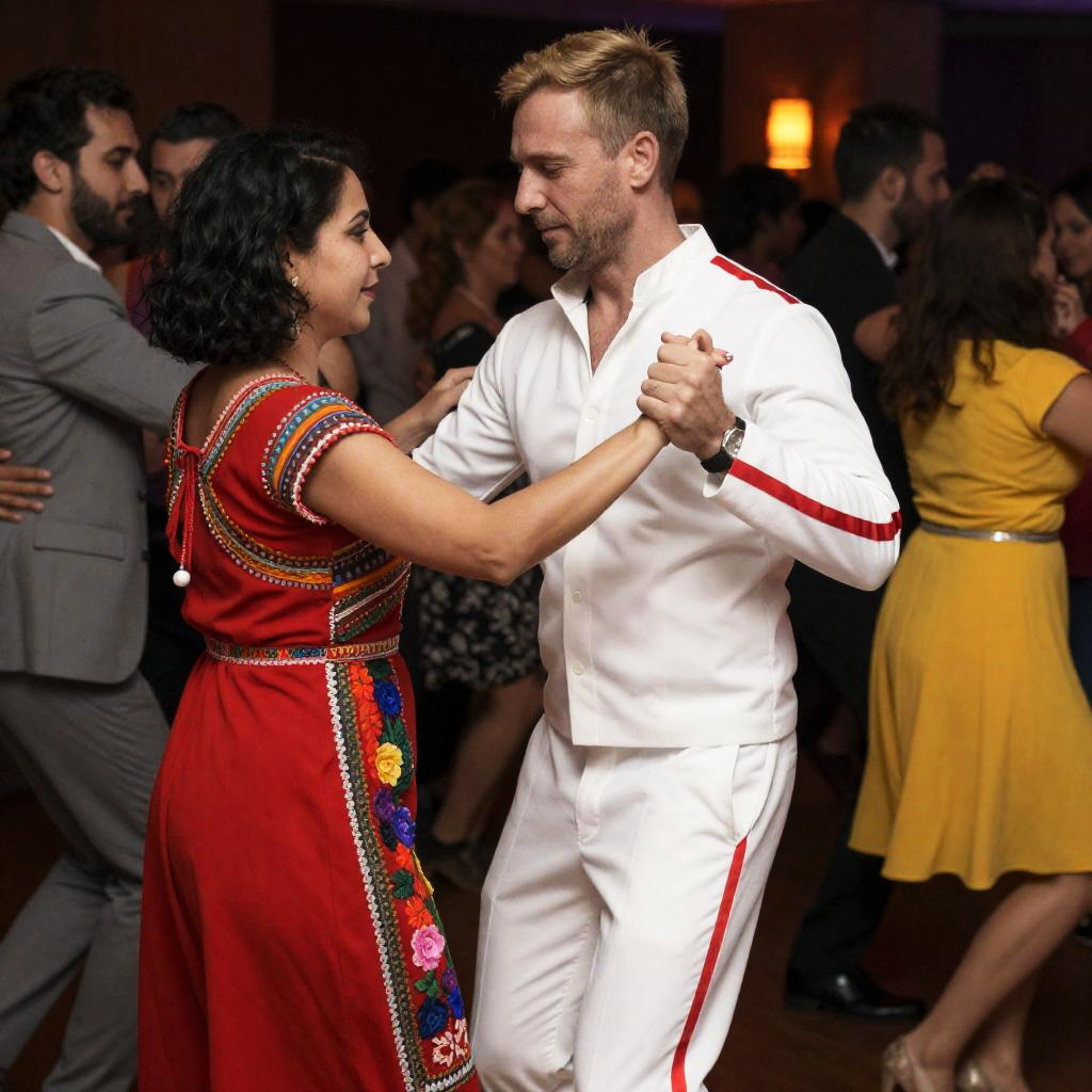 A diverse couple dancing closely at a lively indoor dance party. The woman wears a colorful embroidered red dress and has short black hair. The man is dressed in a white suit with red stripes, featuring short blonde hair. Other couples are dancing in the dimly lit background, including a man in a gray suit and a woman in a yellow dress. The atmosphere is joyful and energetic.