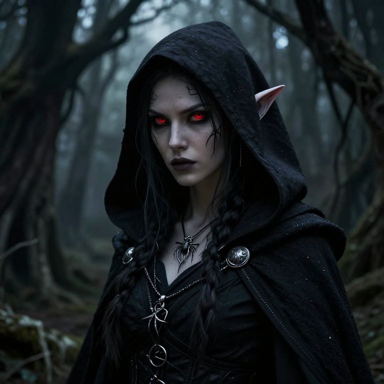 Drow female art illustrating a stealthy rogue dark elf in a hooded cloak blending into the shadows of a twisted forest, her eyes glowing faintly red, with spider tattoos and delicate silver jewelry, evoking a dark fantasy mood with fine details and rich textures.