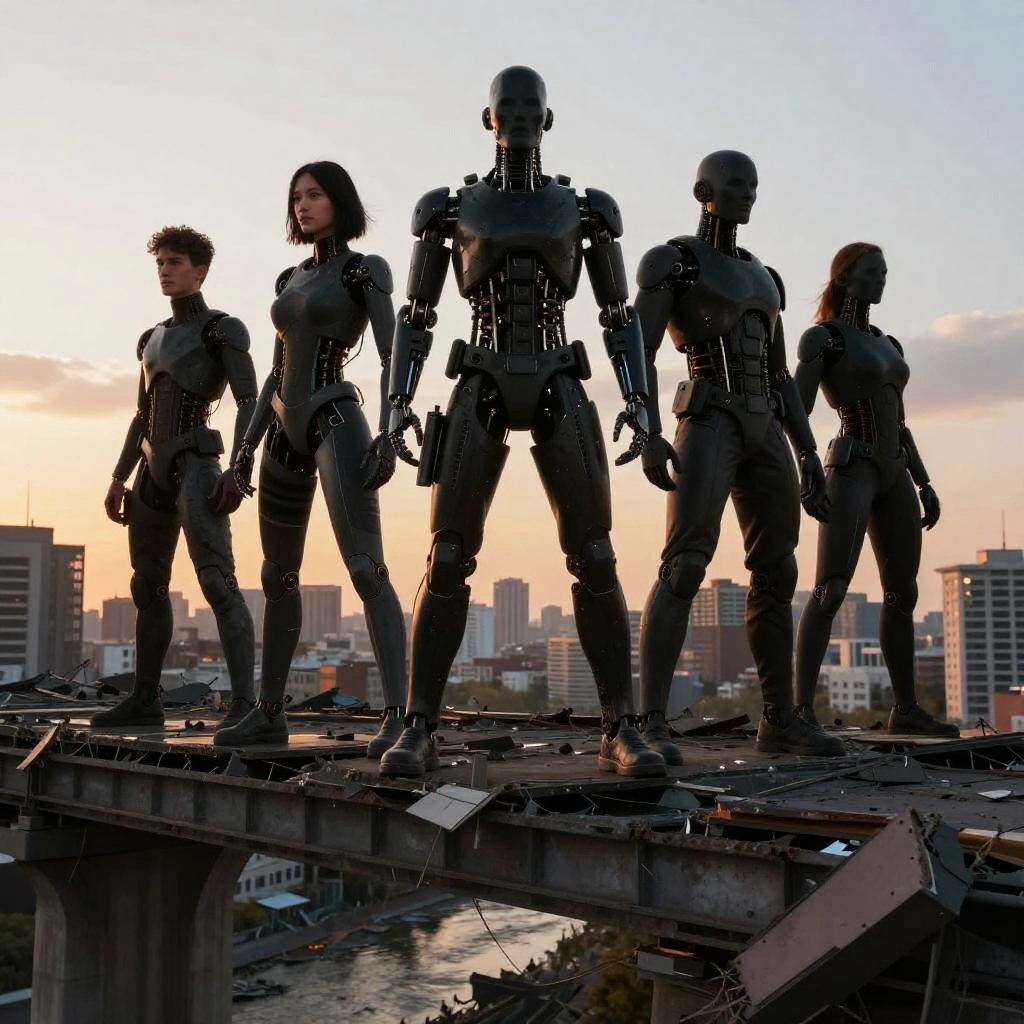 Photograph of five humanoid robots with sleek, black, metallic bodies standing in a row on a damaged urban rooftop at sunset. The robots have feminine shapes, with one in the center being taller and more imposing. The background features a cityscape with tall buildings and a river below. The sky is a gradient of orange and blue. The robots' detailed, jointed limbs and exposed mechanical innards are visible, creating a futuristic, dystopian atmosphere. The rooftop has debris and metal beams, adding to the urban decay. The image has a hyper-realistic, CGI-like quality.