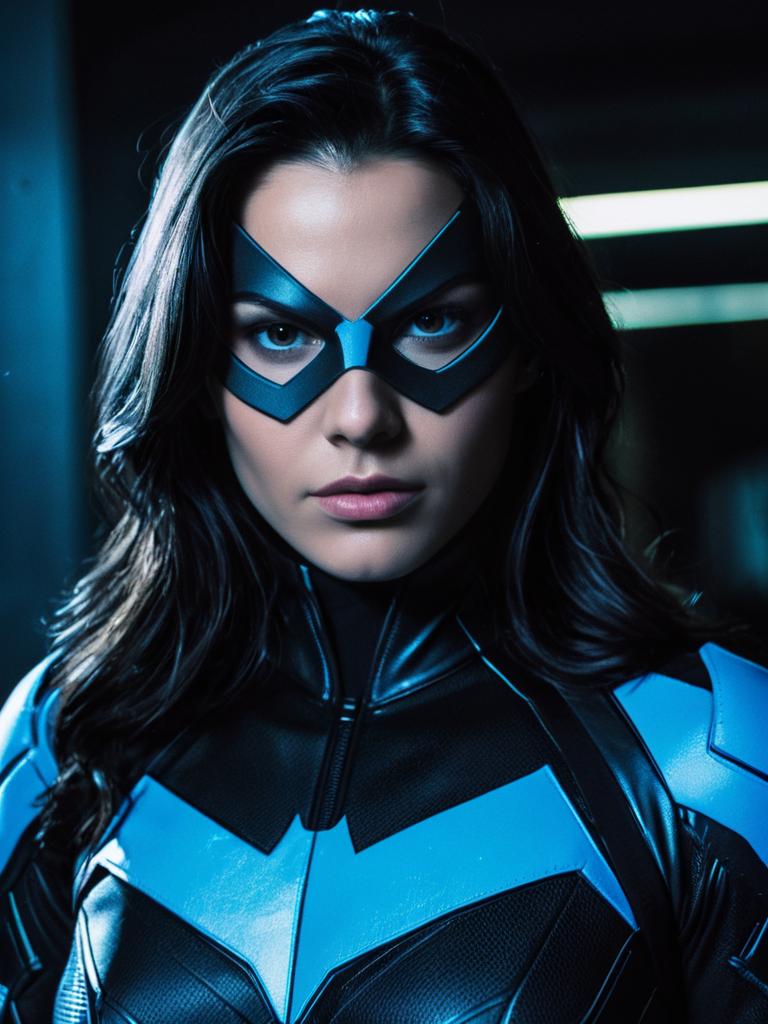 Close-up dramatic headshot of a woman wearing a Nightwing superhero costume featuring a black and blue leather suit with a matching mask. Neon lighting highlights the costume's vibrant blue elements and the woman's intense expression against a dark background.