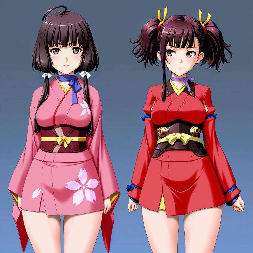 Mumei (kabaneri), koutetsujou no kabaneri, 1girl, red eyes, brown eyes, short hair, brown hair, black hair, twintails, hair ribbon, medium breasts, short kimono, ribbon choker, long sleeves, by artist t2r, illustrious