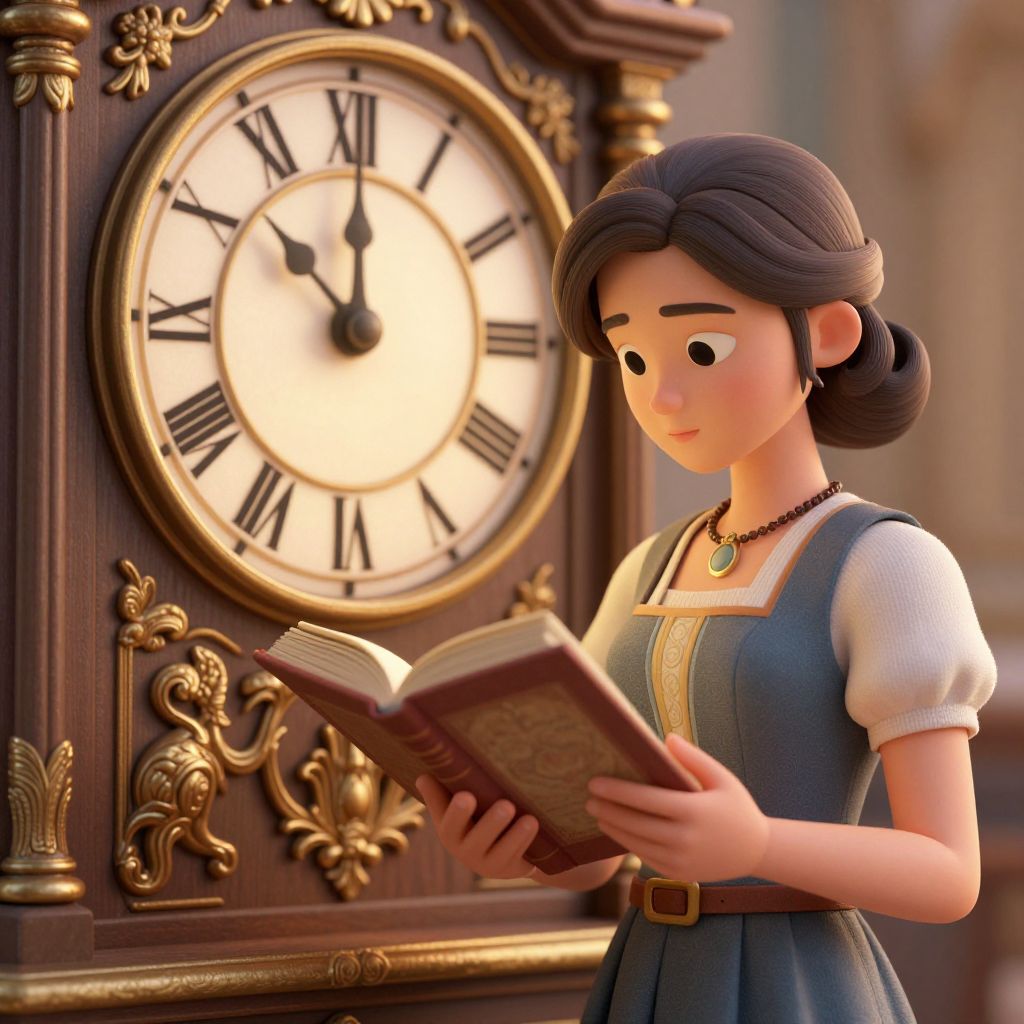 This digital CGI illustration features a young, fair-skinned girl with dark, neatly tied hair, wearing a blue dress with a white puffed-sleeve blouse and a brown belt. She is standing in front of an ornate, gold-framed clock with black Roman numerals and black hands. The girl is holding an open, brown leather-bound book with her right hand and has a focused expression. She wears a simple black necklace with a small pendant. The background is softly blurred, emphasizing the clock and the girl. The artwork has a smooth, slightly cartoonish style with warm lighting that highlights the clock's intricate design and the girl's gentle features.
