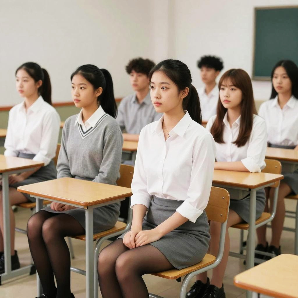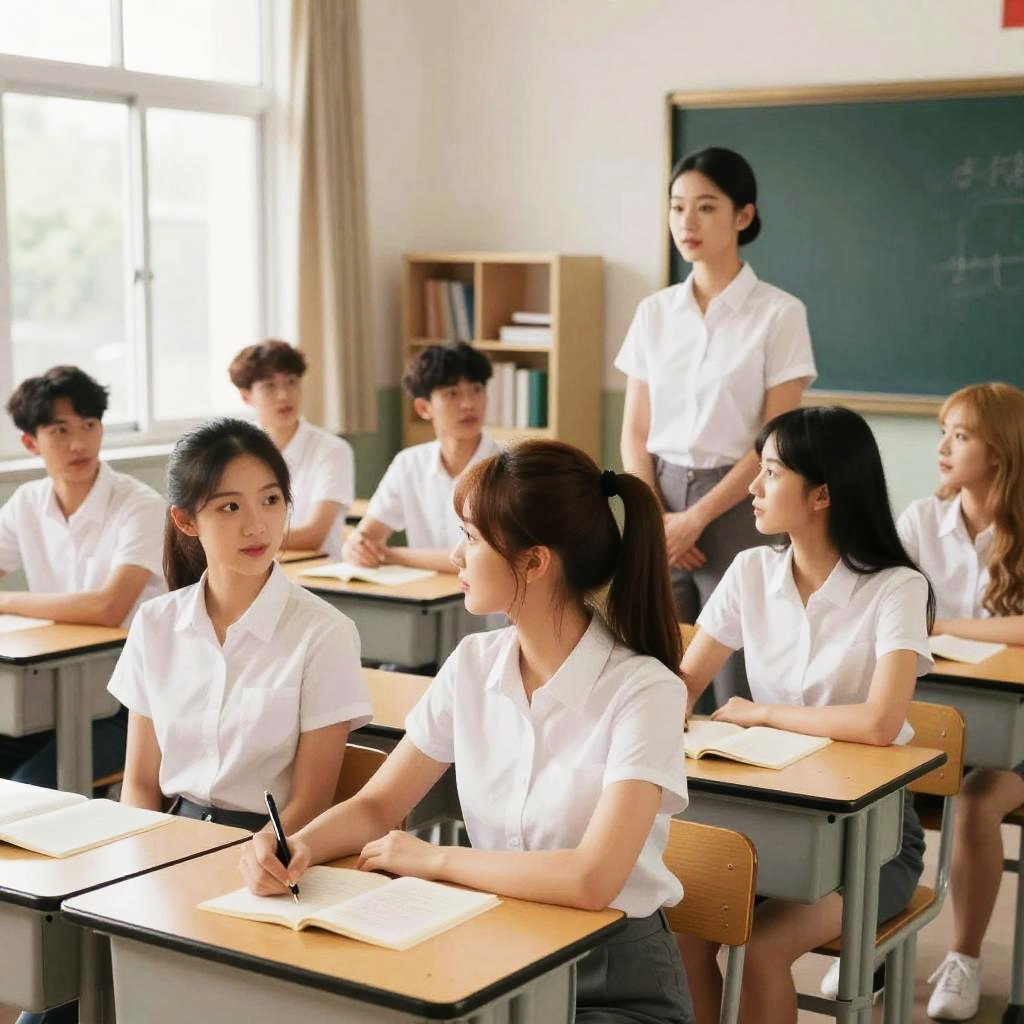 A group of Asian students sitting attentively at their desks in a classroom. The students include boys and girls with black hair, wearing casual clothing such as white t-shirts, a light blue shirt, and white pants. The background includes classroom furniture and a window with natural light.