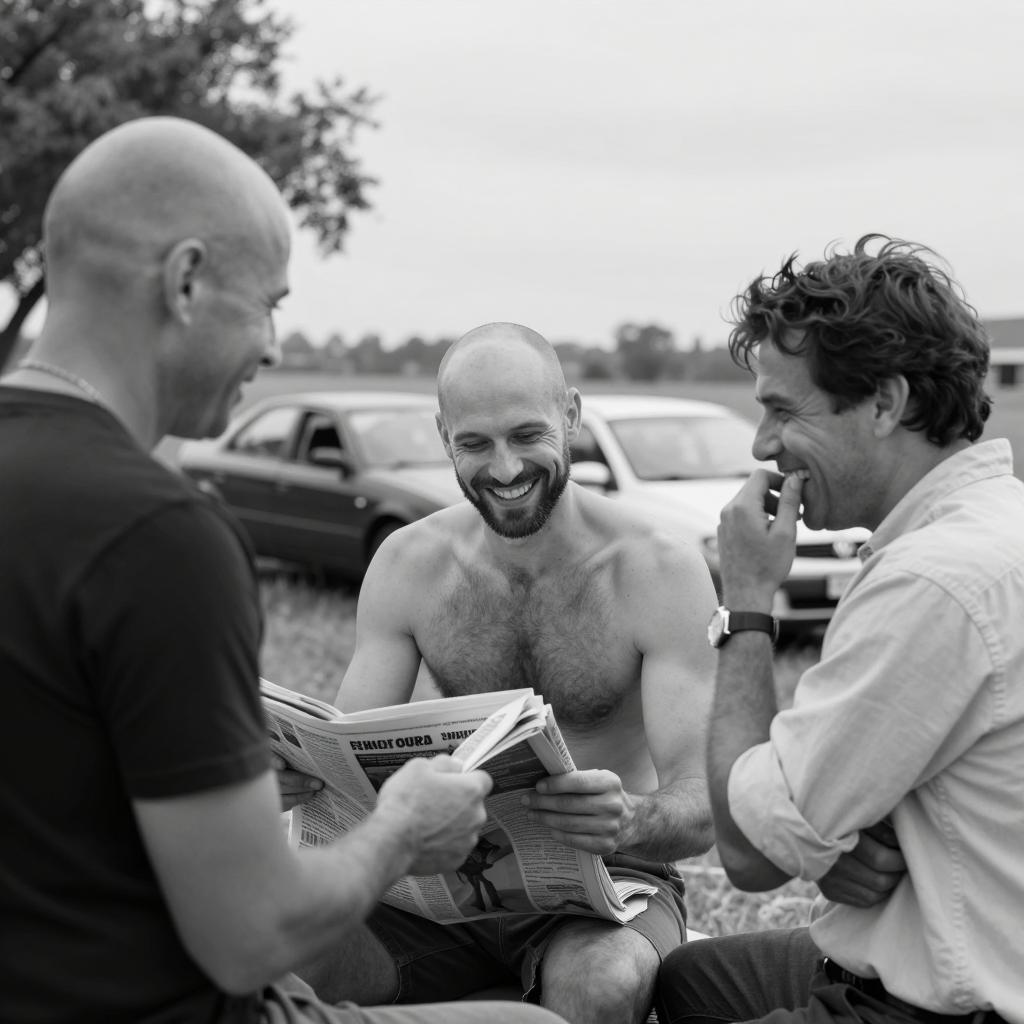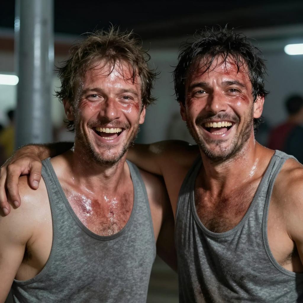 Two middle-aged men with messy hair, sweat on their faces, and blood on their cheeks. Both wearing gray tank tops, arms around each other's shoulders. Smiling widely with mouths open. Background shows blurred lights and a metal pillar. Both men have rough, unshaven facial hair. One has a slightly larger build and more visible chest hair.