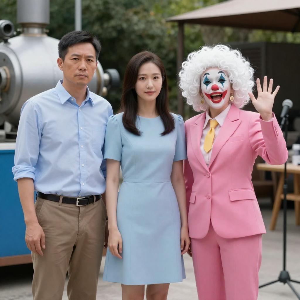 Photograph of three people standing outdoors. Man on left, light blue shirt, brown pants, serious expression. Woman in center, light blue dress, neutral expression. Woman on right, bright pink outfit, white curly wig, clown makeup, waving, intense expression. Background includes industrial equipment, greenery, and a microphone stand.