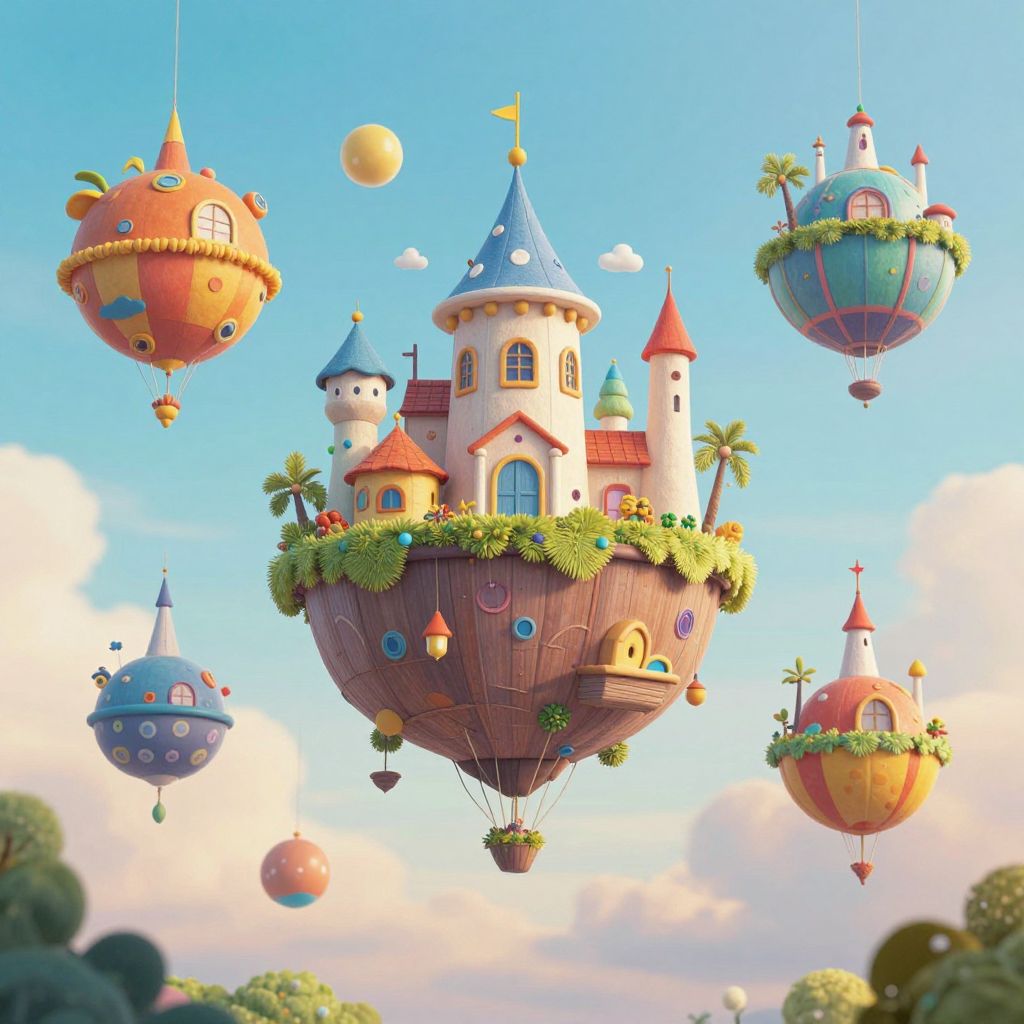Childhood dreams take flight as whimsical floating islands, where vibrant colors, playful structures, and dangling ornaments weave a tapestry of wonder, evoking a sense of boundless freedom and nostalgic joy.