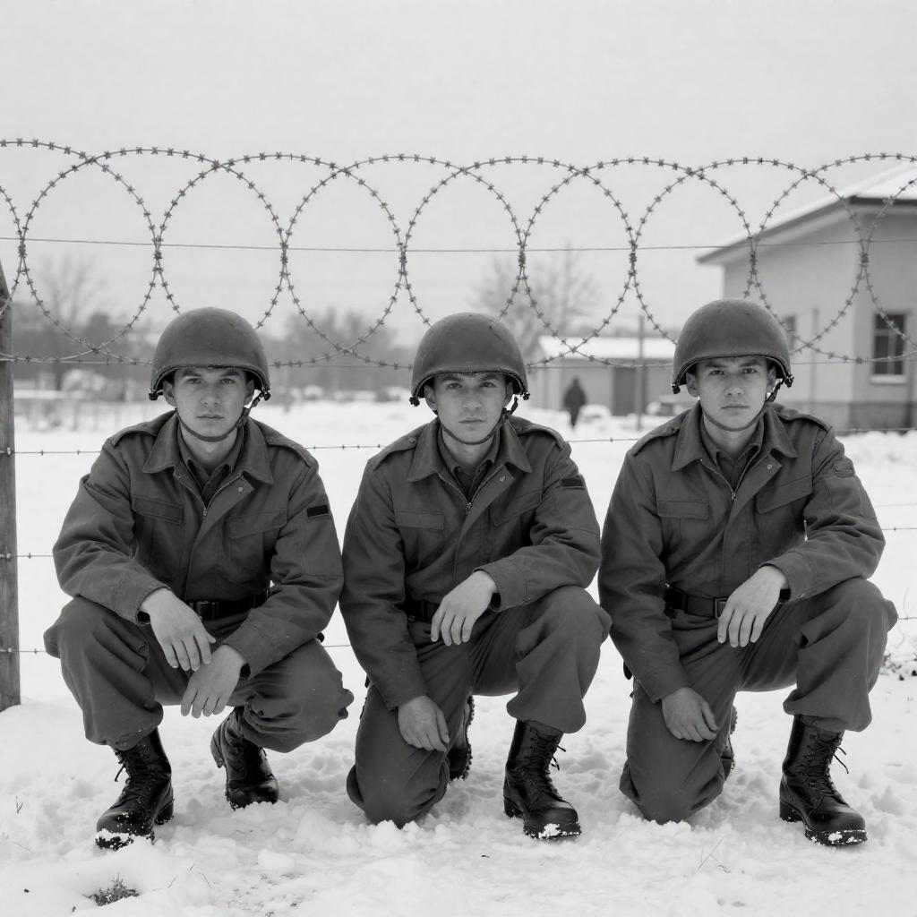 Black-and-white photograph of three soldiers crouching behind a dense coil of barbed wire. They wear military uniforms with helmets and name tags. The soldiers' focused expressions are visible through the wire. The background is a snowy, outdoor setting with a building partially visible on the right.