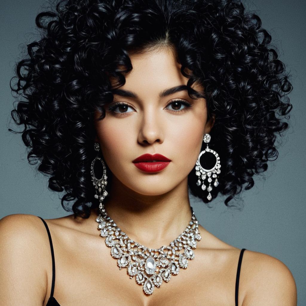 Bad curly hairstyle,1girl, jewelry, solo, earrings, realistic, necklace, hoop earrings, breasts, curly hair, cleavage, lips, black hair, makeup, medium breasts, lipstick