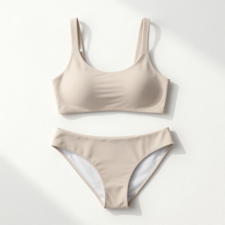 A minimalist two piece bikini displayed on a white sand beach, smooth lines and neutral tones, highlighting clean design and breathable fabric, with soft morning light casting gentle shadows, MidJourney style.