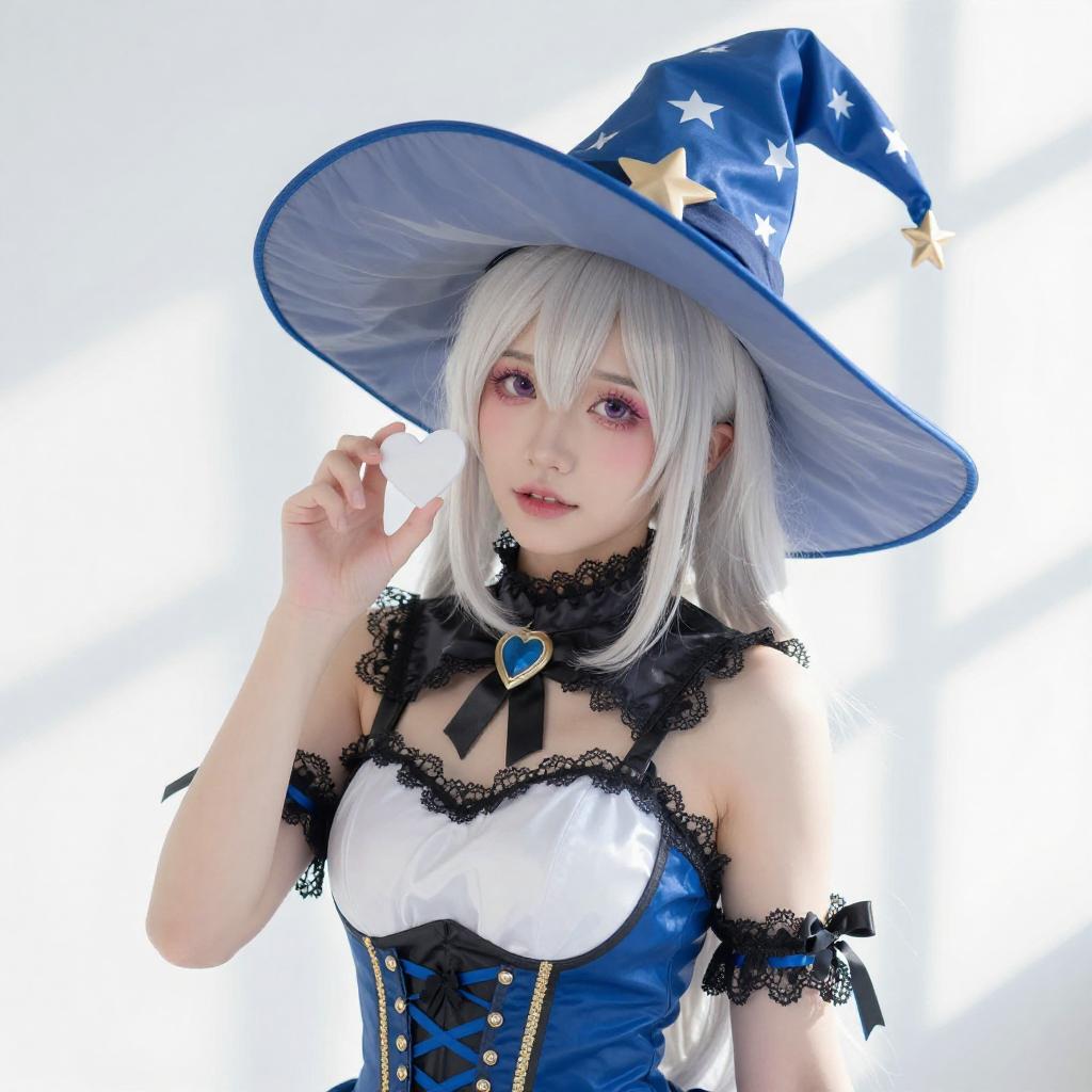 Photograph of a cosplayer with long, silver hair in twin buns, wearing a black and blue dress with lace and ribbon details. She has her eyes closed, touching her chest with one hand. Background includes white cherry blossoms and a dark, ured wall. Her makeup is bold with red lipstick.