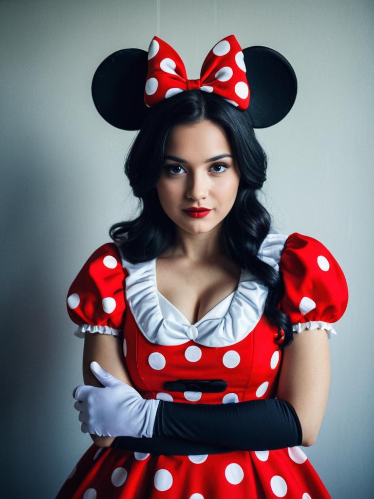 Woman in Minnie Mouse costume, photorealistic cosplay portrait, cinematic realism