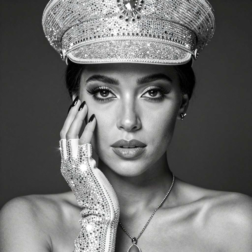 Black and white photo of a woman with dark skin wearing a sparkly, ured hat and matching glove, black nail polish, subtle makeup, necklace, and confident expression. Her right hand touches her face. Bright light reflection on glove.