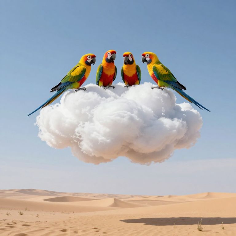 Vibrant parrots perched on a whimsical cloud float serenely above a desolate desert, defying gravity in a surreal tableau of nature and imagination.