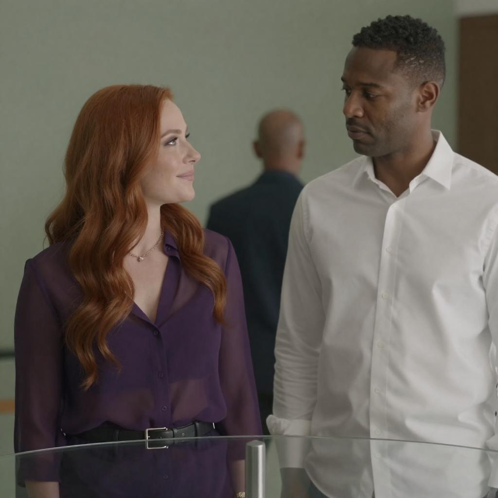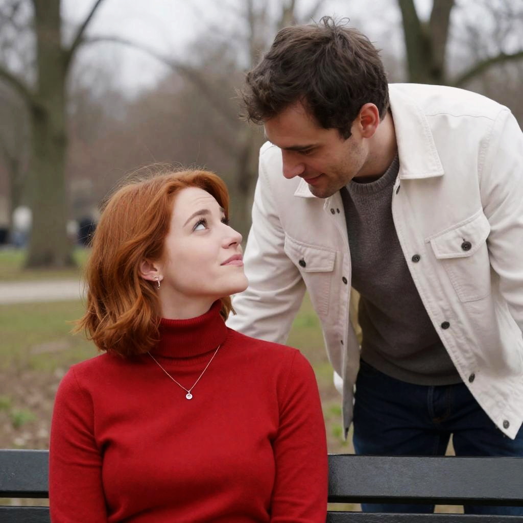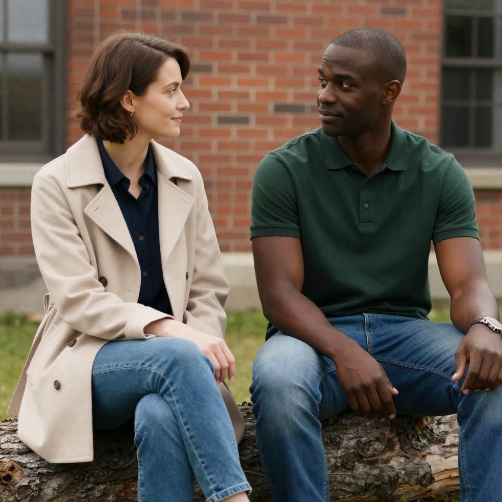 Photograph of a black man and a white woman sitting outdoors at night. The man has a bald head and beard, wears a dark polo shirt, looks at the woman with a slight smile. The woman has red hair in a bun, wears a dark cowl-neck top, looks at the man with a subtle smile. Background features Christmas lights on trees and house. The man's right hand rests on his lap, the woman's hands are on her lap. Both are seated on a wooden bench.