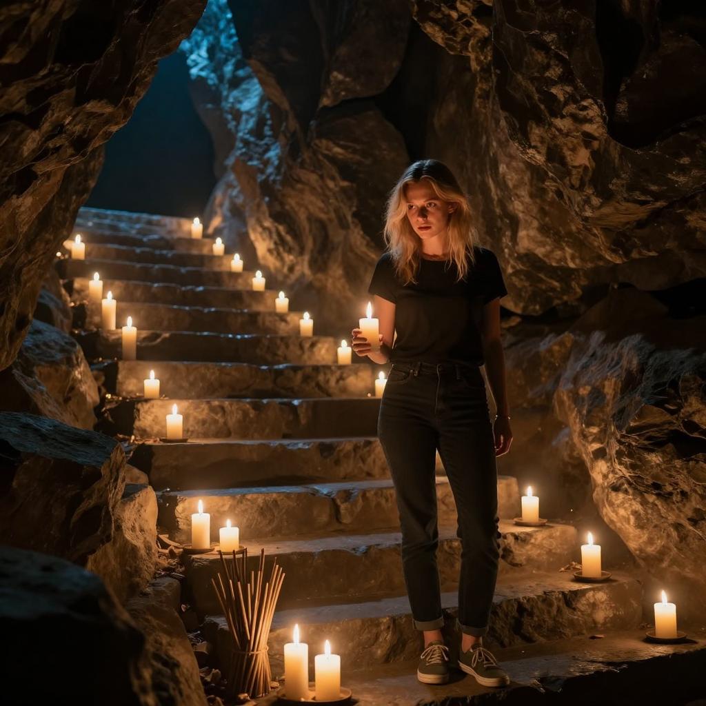 Young woman with fair skin and blonde hair in a black shirt stands in a dimly lit cave, lighting candles along a stone staircase. Blue light illuminates the left side. Numerous candles line the steps and a large bundle of candles sits in the foreground. Woman's expression is intense. Cave walls are rocky and dark.
