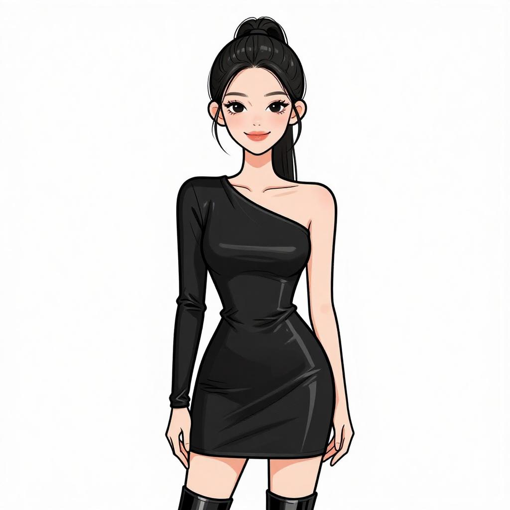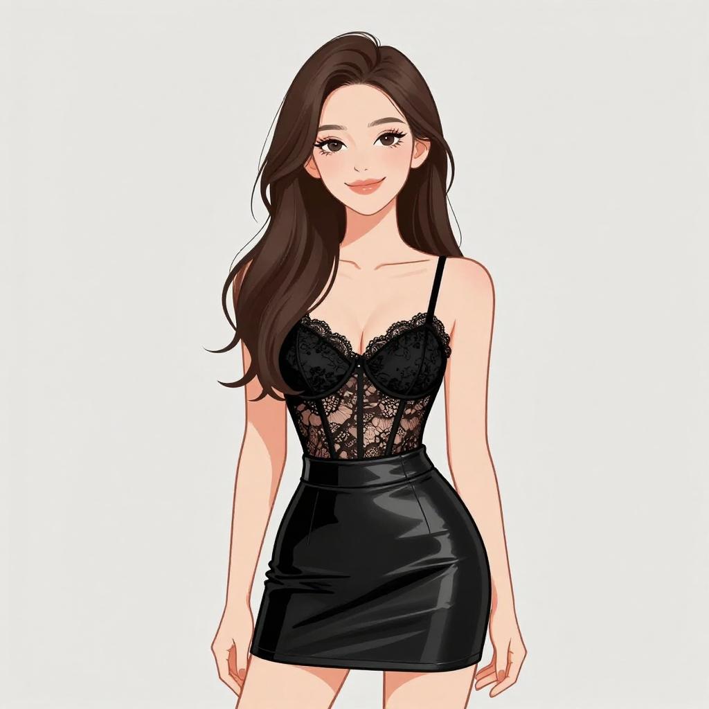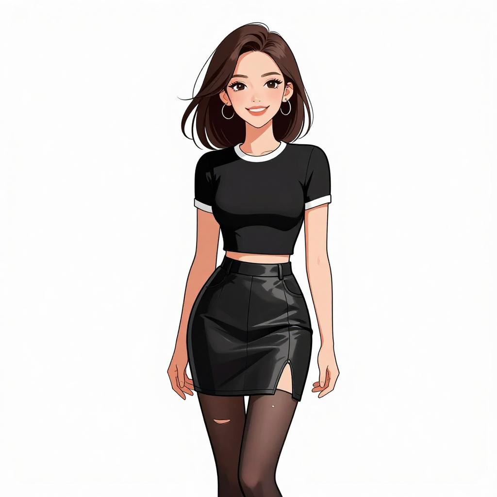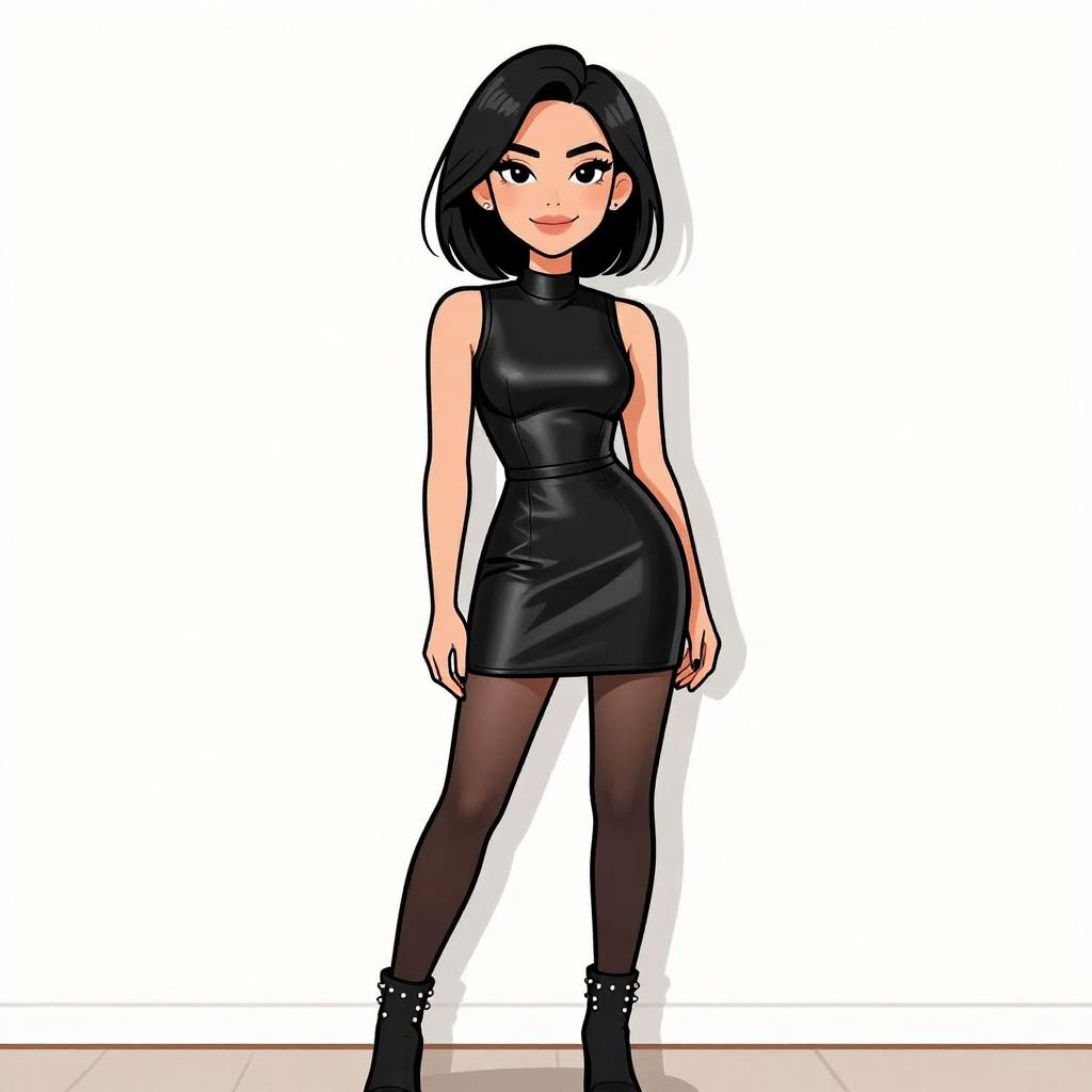 Woman with pretty face and pretty hair. smiling Woman, edgy dominatrix-inspired, black patent leather corset with silver grommets and buckled straps, matching mini skirt with pleated hemline, thigh-high boots in black patent leather, choker necklace with spikes, chunky silver chain bracelet, medium length straight blonde hair pulled up by hand, studio background with a white backdrop. --sref 1467