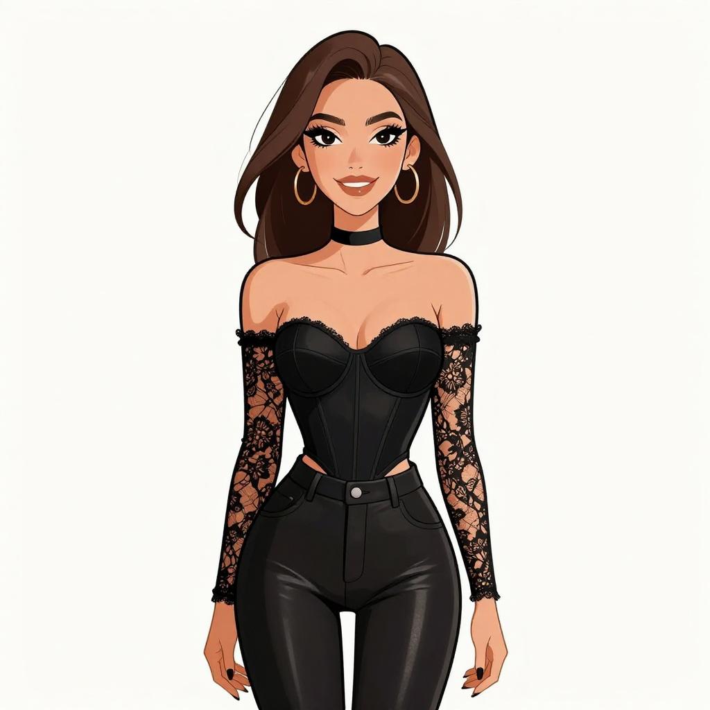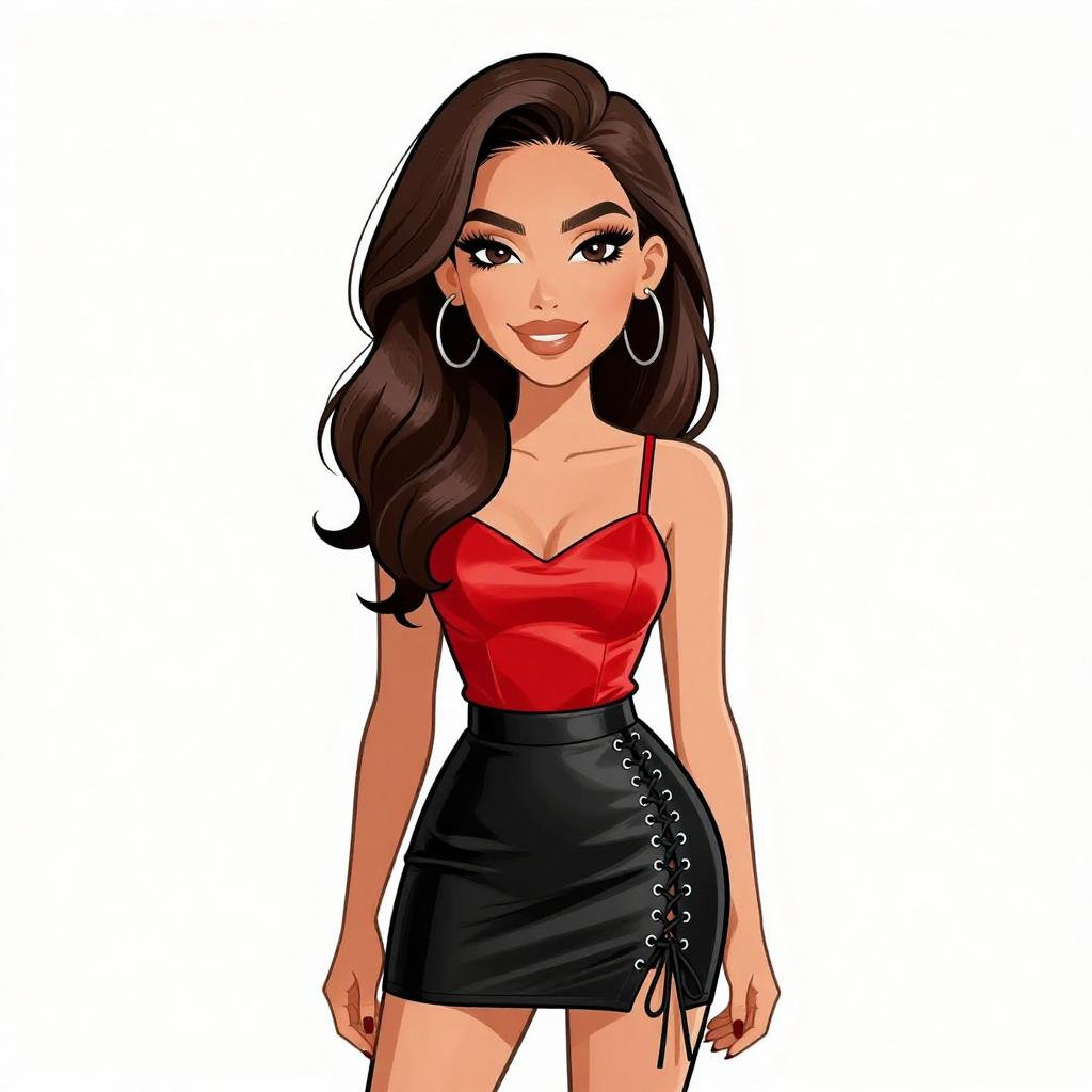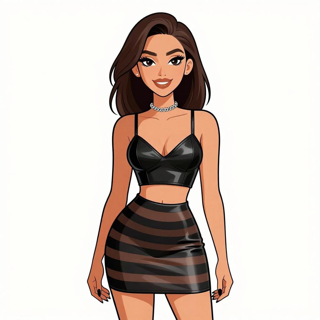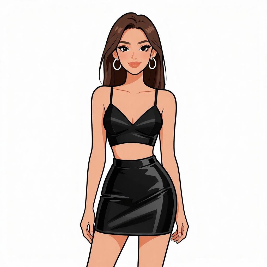 Woman with pretty face and pretty hair. smiling Woman, edgy dominatrix-inspired, black patent leather corset with silver grommets and buckled straps, matching mini skirt with pleated hemline, thigh-high boots in black patent leather, choker necklace with spikes, chunky silver chain bracelet, medium length straight blonde hair pulled up by hand, studio background with a white backdrop. --sref 1467
